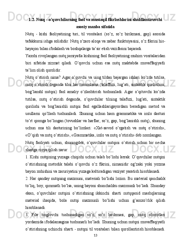 11 1.2. Nutq - o’quvchilarning faol  va mustaqil  fikrlashlarini shakllantiruvchi