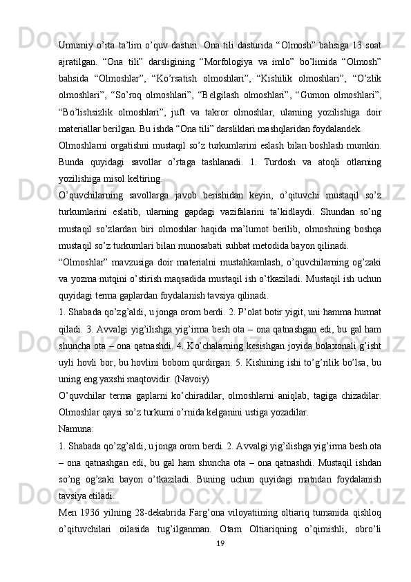 eslatadi. Shuningdek, so’z turkumlarini o’rganish jarayonida leksik sinonimlar   /ot