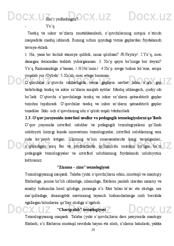 “ , “ Tasdiq va inkor  so’zlarni  “ o’rganish  jarayonida  o’quvchilarning og’zaki  va
