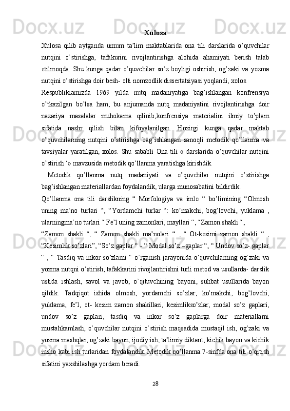 Xulosa   qilib   aytganda   umum   ta’lim   maktablarida   ona   tili   darslarida   o’quvchilar