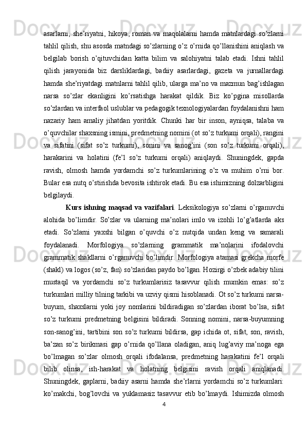 sinonimi   imkoniyatlaridan   foydalanganligini   aytadi.   Ayniqsa,   leksika   bo’limini