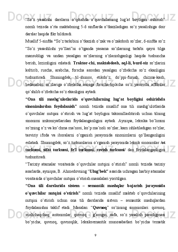 nomli   tezisda   o’rta   maktabning   5-6   sinflarda   o’tkaziladigan   so’z   yasalishiga   doir