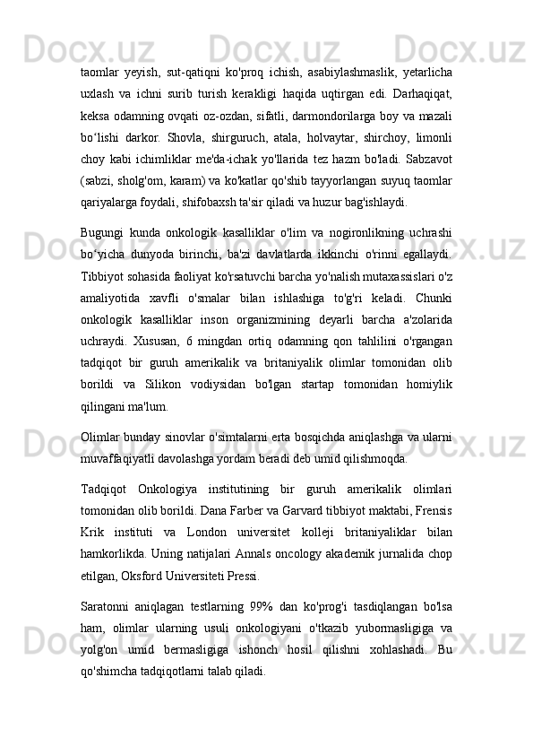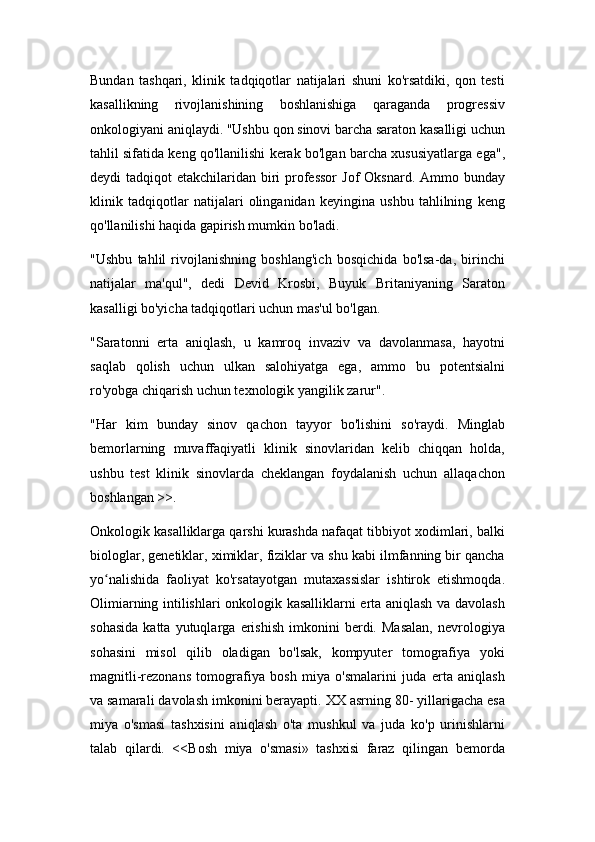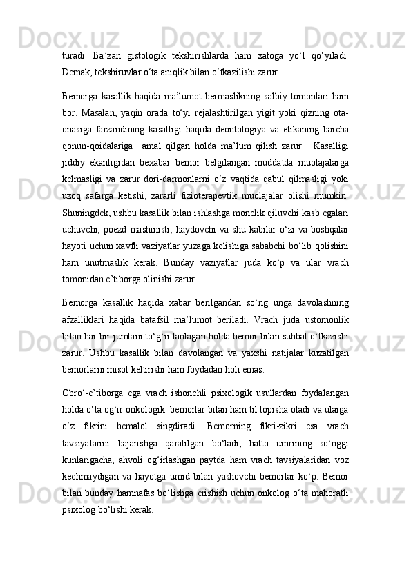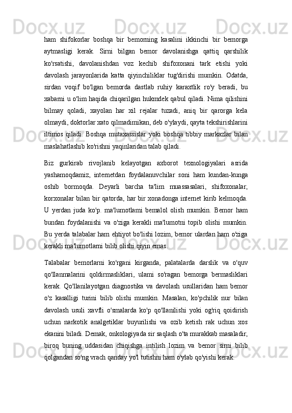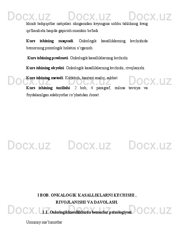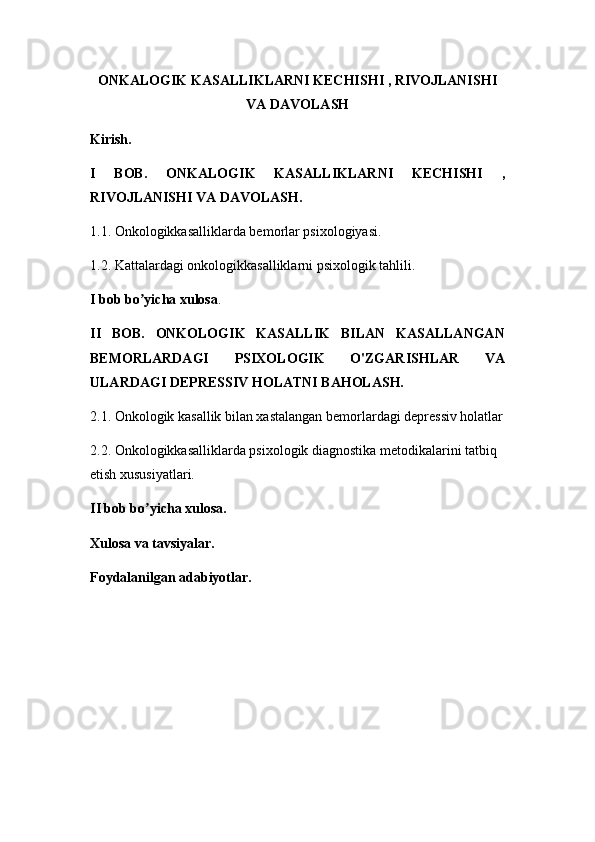 I BOB. ONKALOGIK KASALLIKLARNI KECHISHI , RIVOJLANISHI VA DAVOLASH.