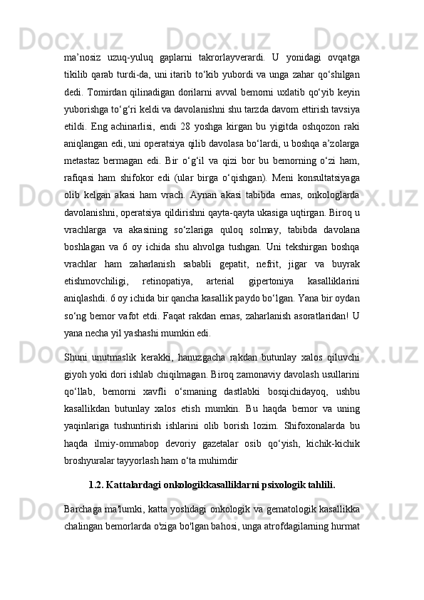 1.2. Kattalardagi onkologikkasalliklarni psixologik tahlili.