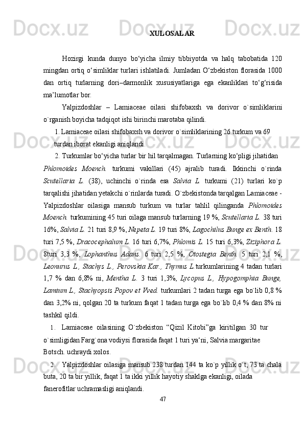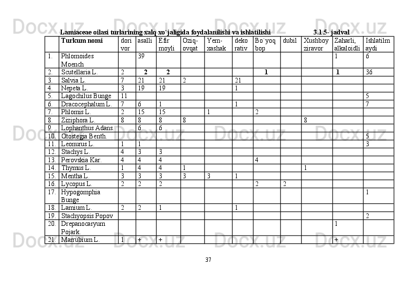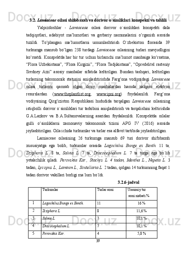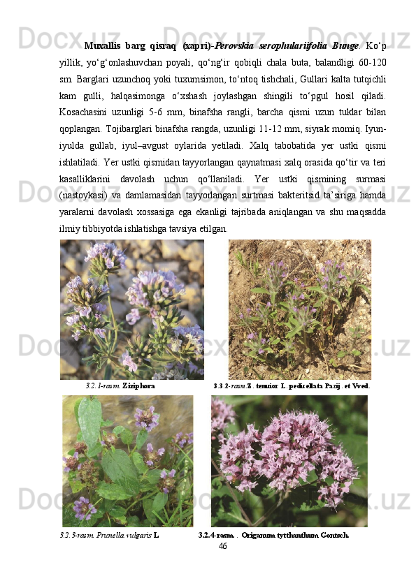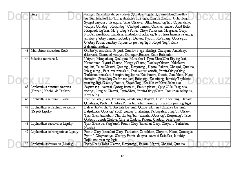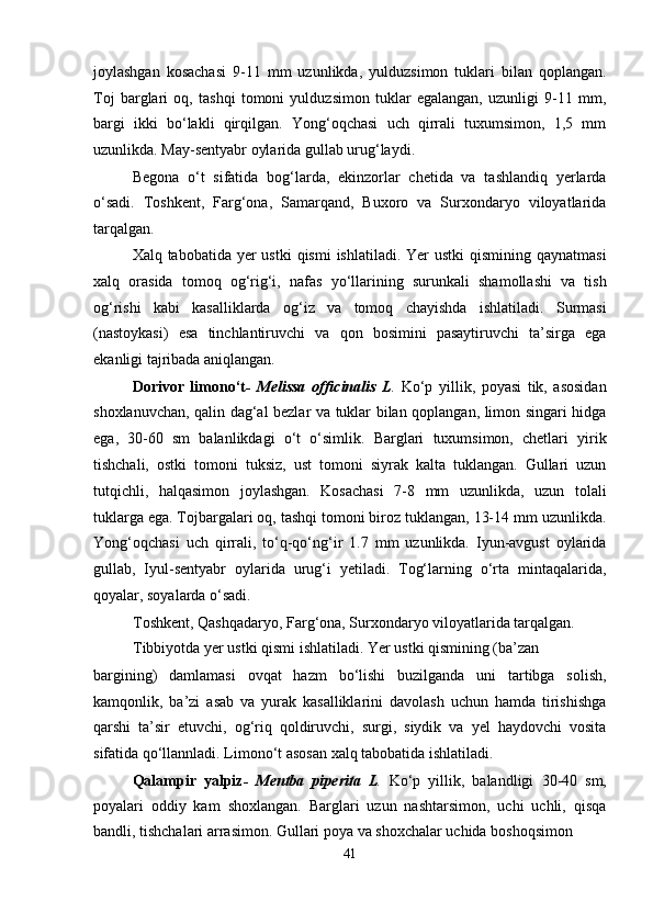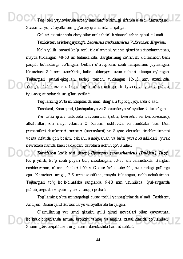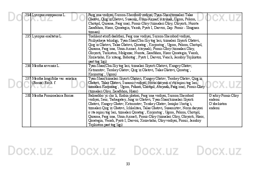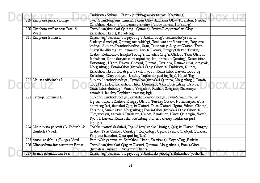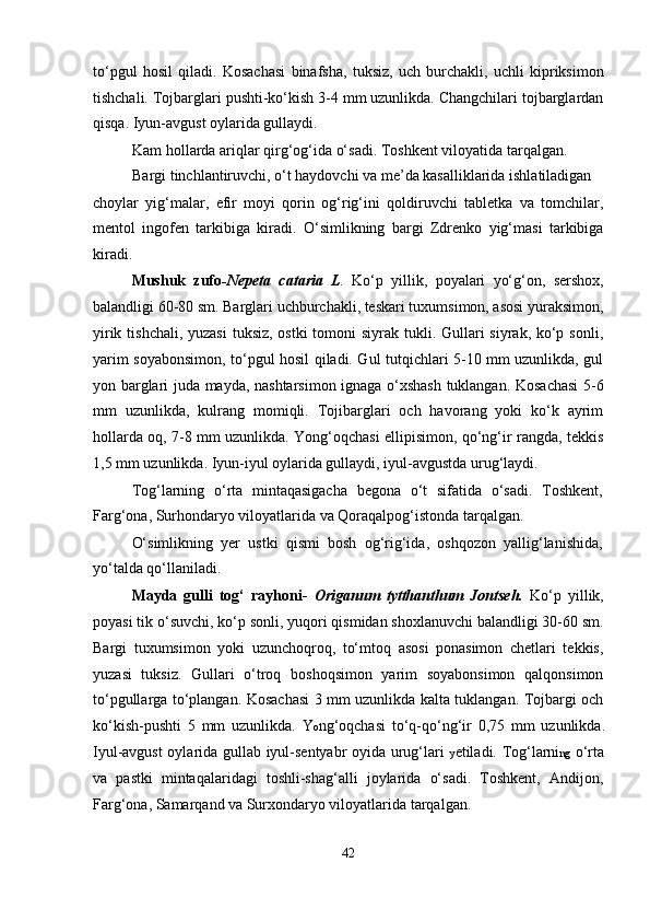 229 Origanum tyttanthum Gontsch. Shahar atrofi: Toshkent, Farg`ona, Andijon, Jalolobad, Xiva, Chardjou, Farab,