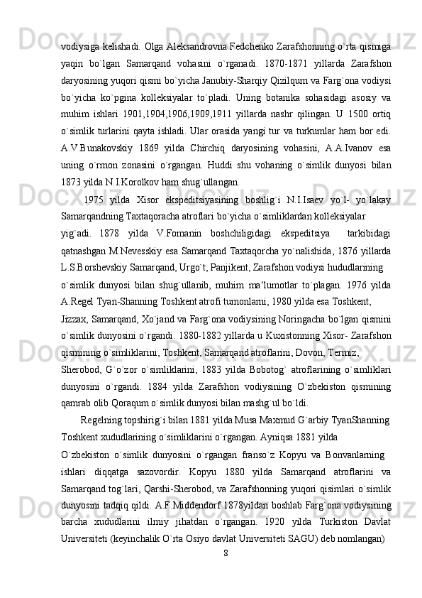 dunyosini   o`rgandi.   1884   yilda   Zarafshon   vodiysining   O`zbekiston   qismining