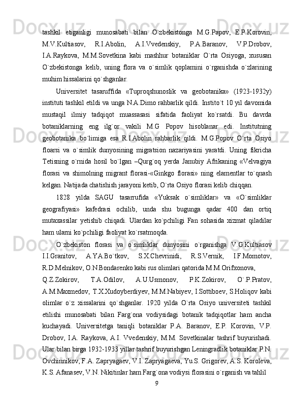 barcha   xududlarini   ilmiy   jihatdan   o`rgangan.   1920   yilda   Turkiston   Davlat