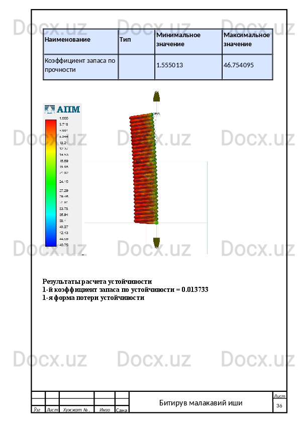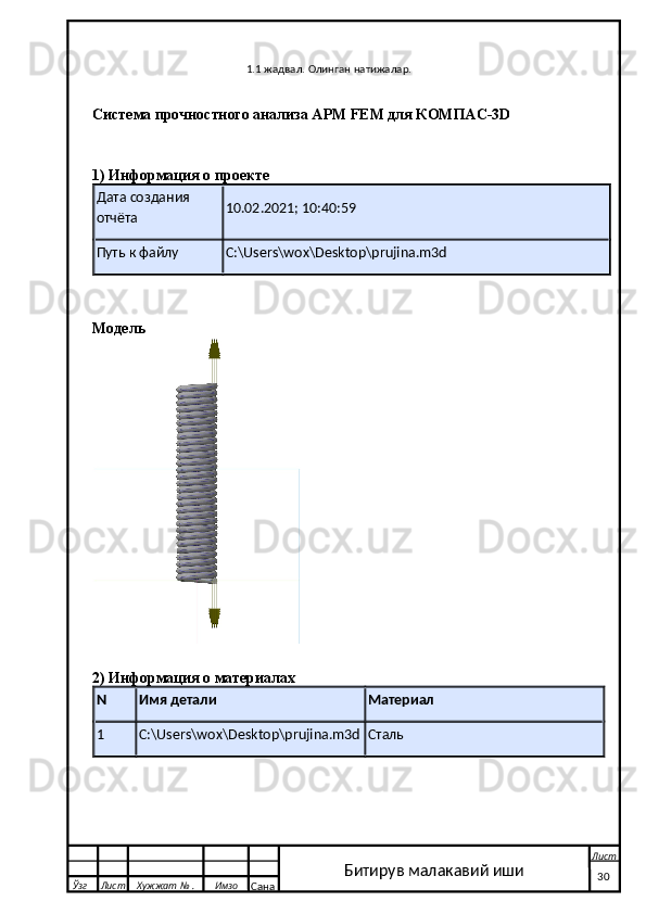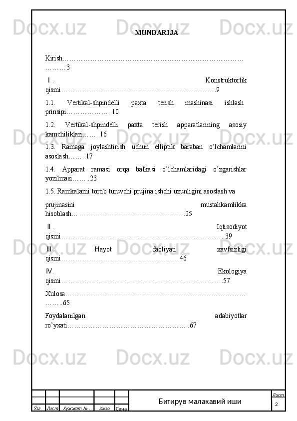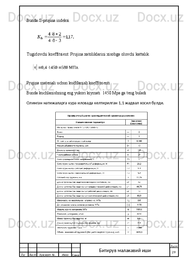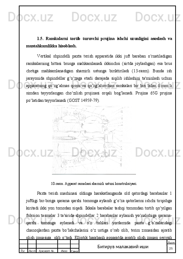 1.5. Ramkalarni tortib turuvchi prujina ishchi uzunligini asoslash va prujinasini mustahkamlikka hisoblash………………………………………….25 | |