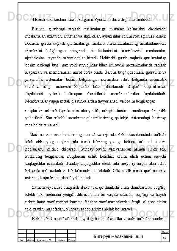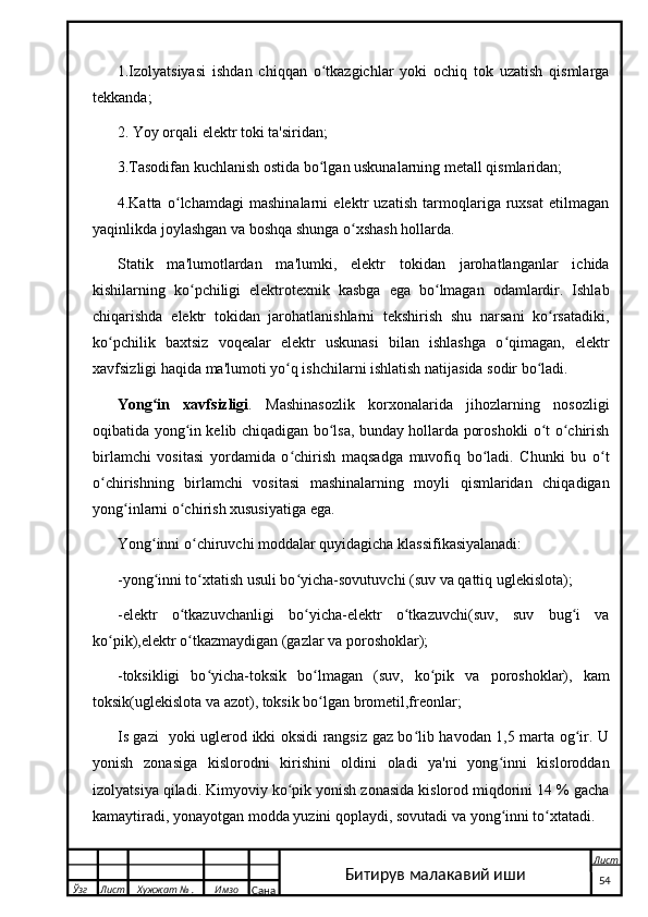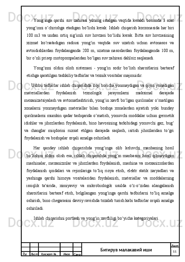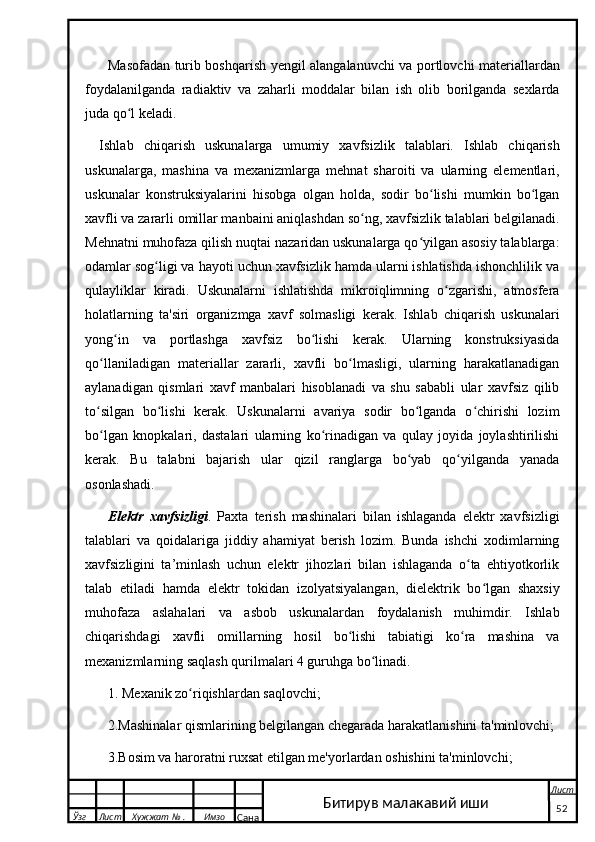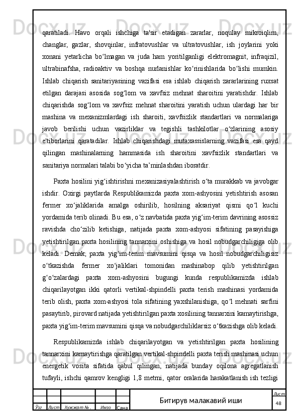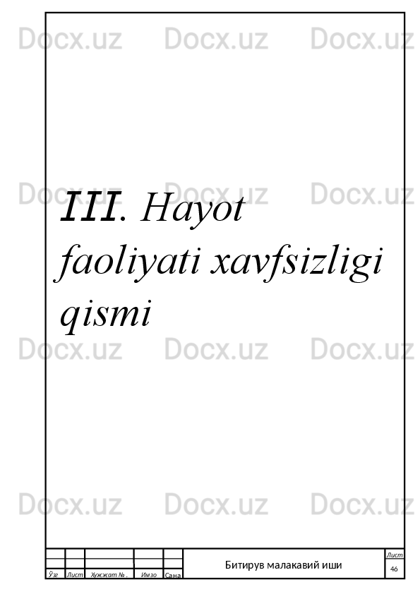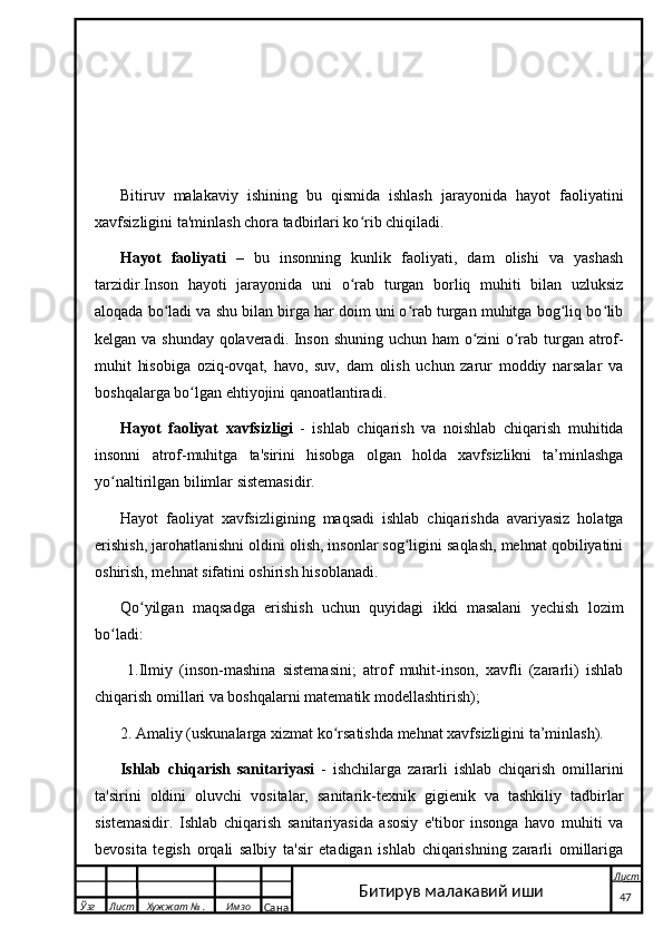| Ⅲ. Hayot faoliyati xavfsizligi qismi……………………………………………46 | |