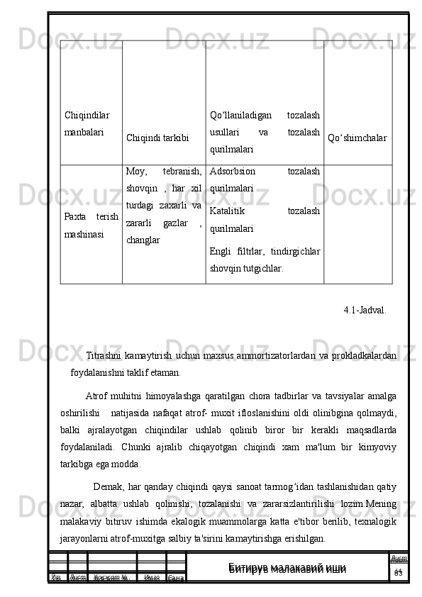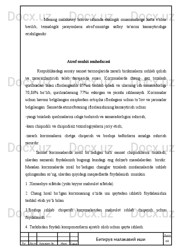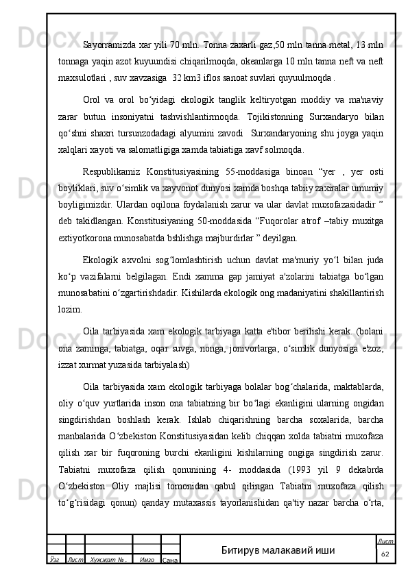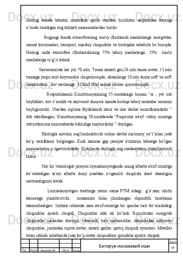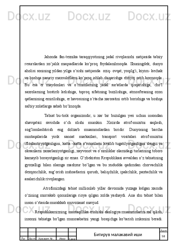 | Ⅳ. Ekologiya qismi…………………………………………………………….57 | |