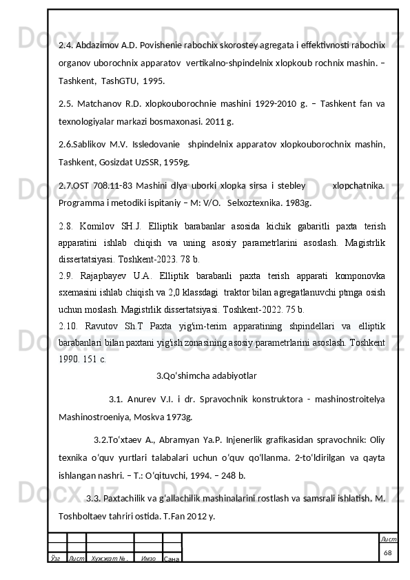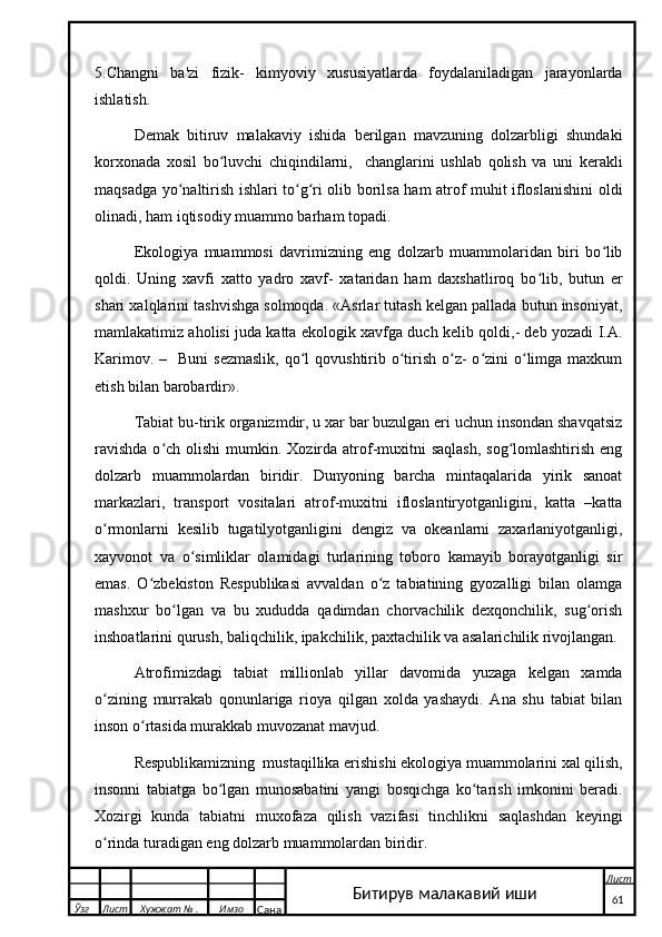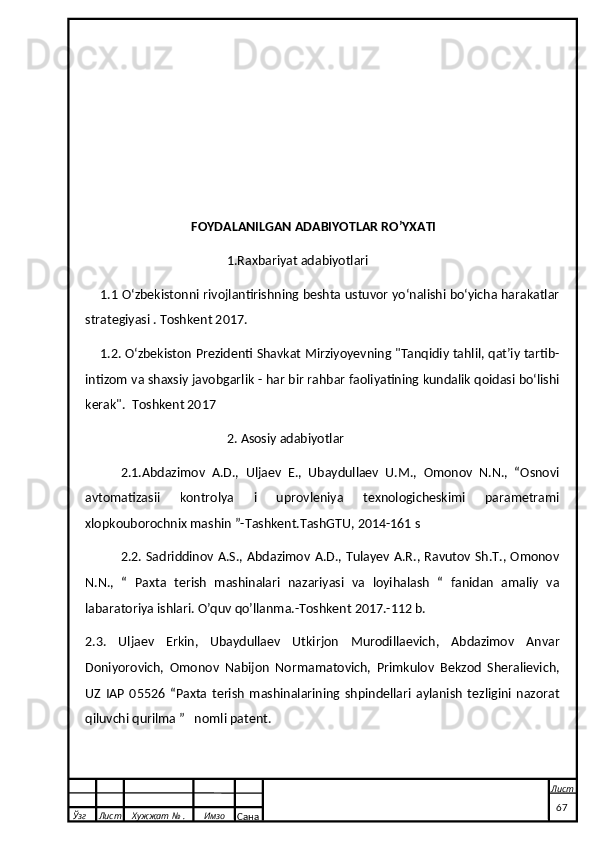 | Foydalanilgan adabiyotlar ro’yxati……………………………………………..67 |