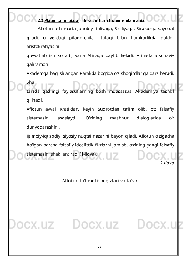 2.2 Platon ta’limotida ruh va borliqni tushunishda mantiq. 37