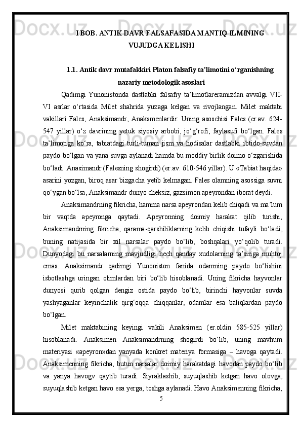 1.1 Antik davr mutafakkiri Platon falsafiy ta’limotini o‘rganishning nazariy metodologik asoslari 5