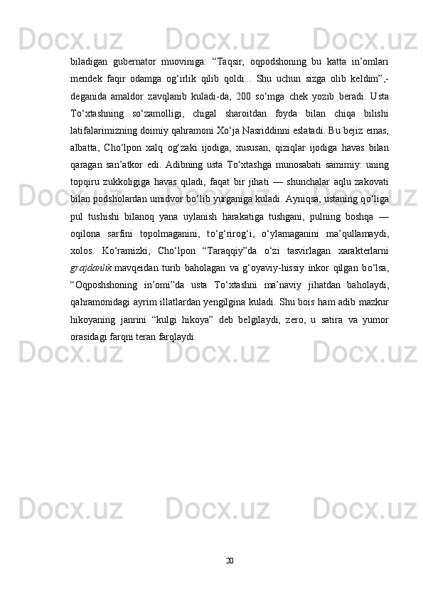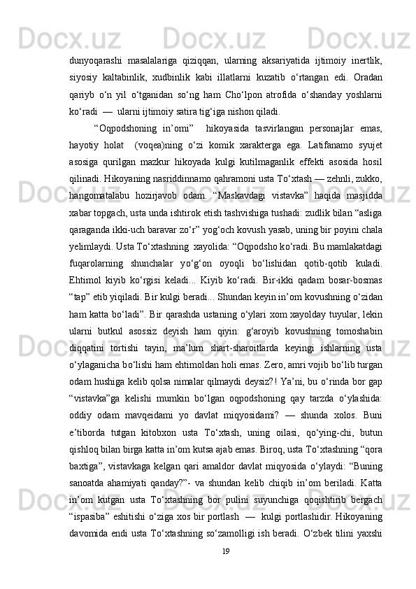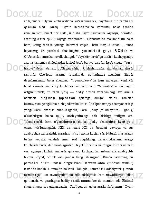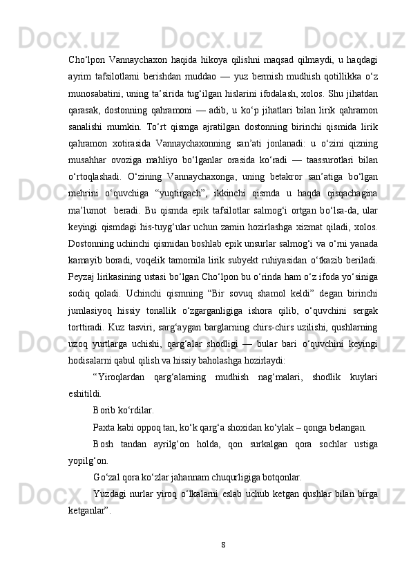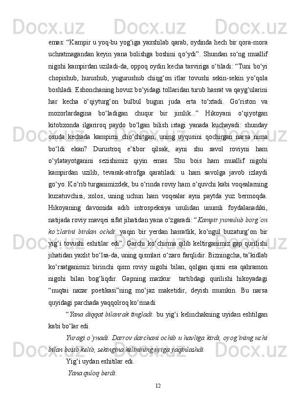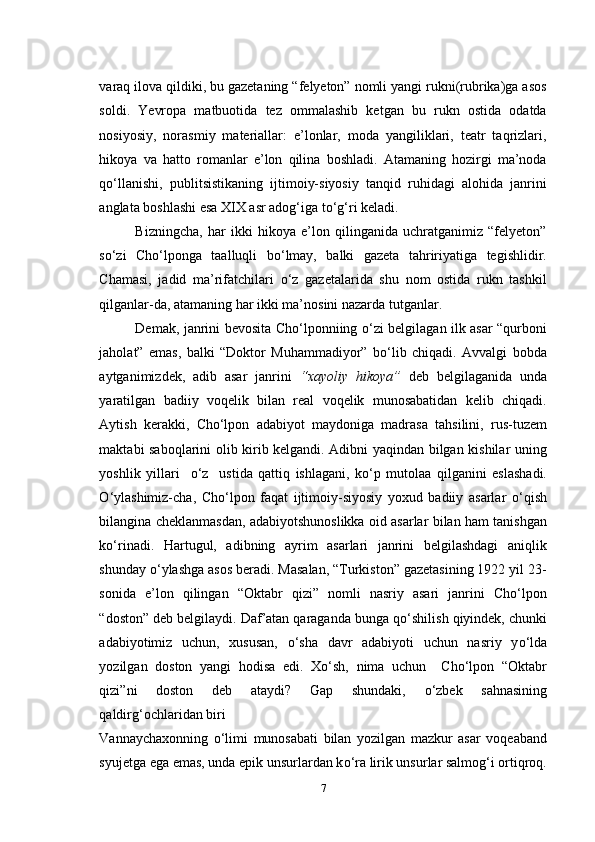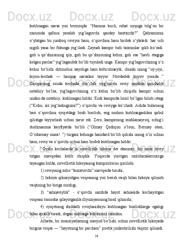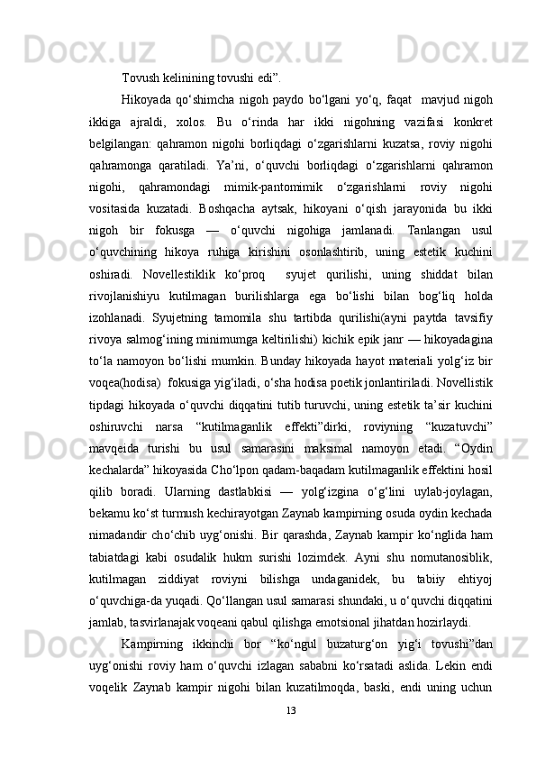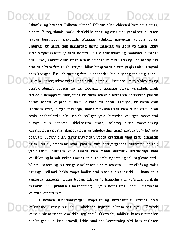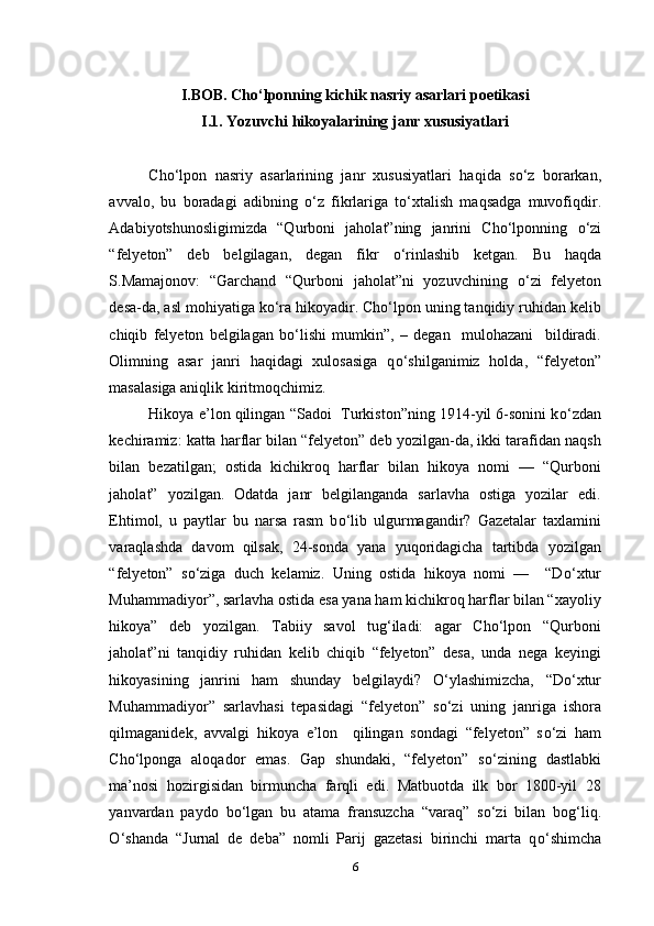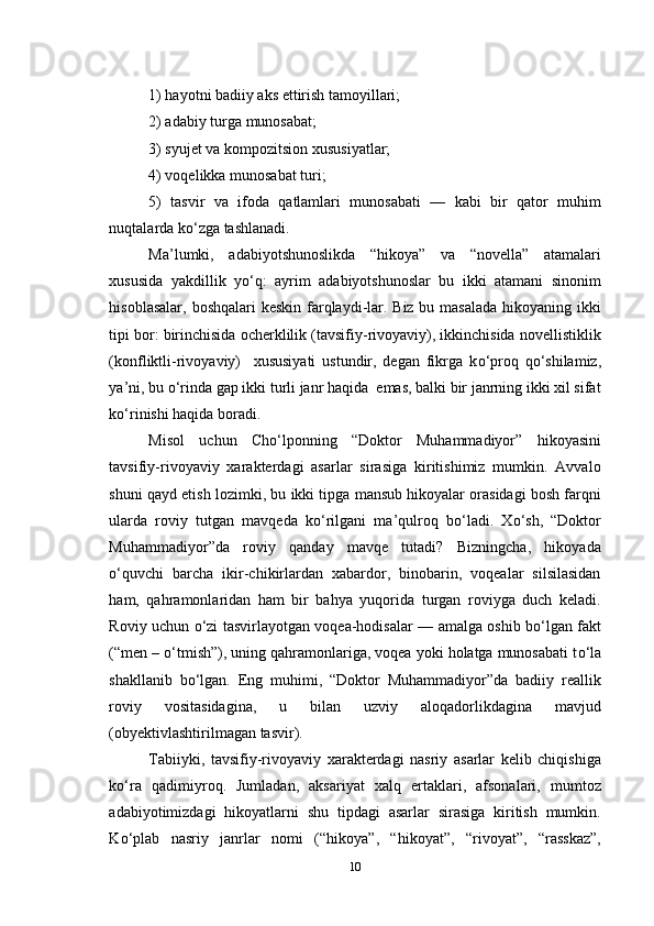 I.1. Yozuvchi hikoyalarining janr xususiyatlari...........................6