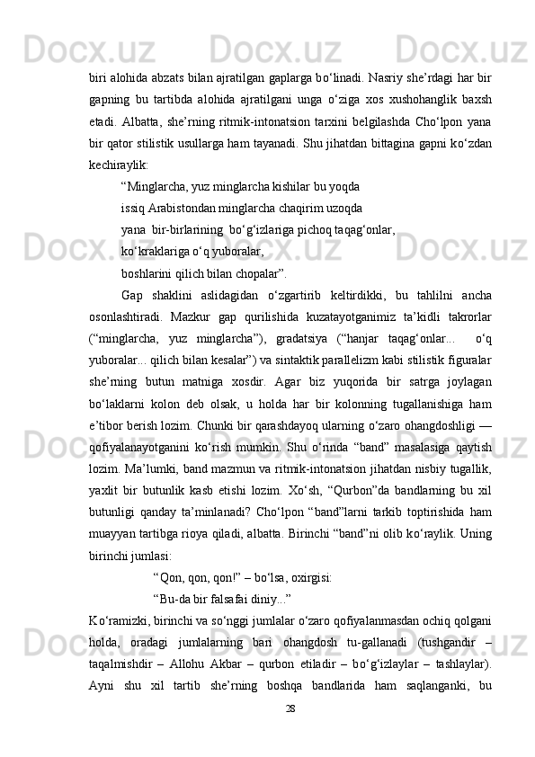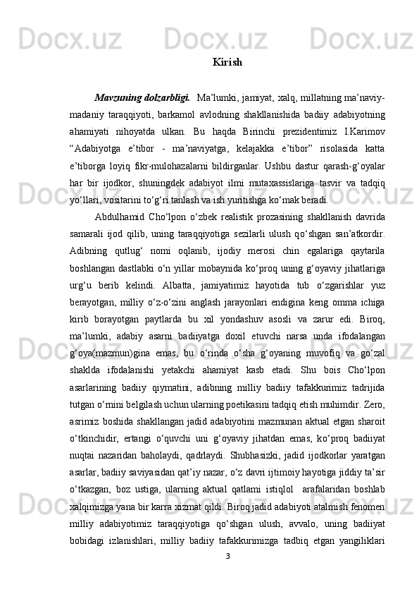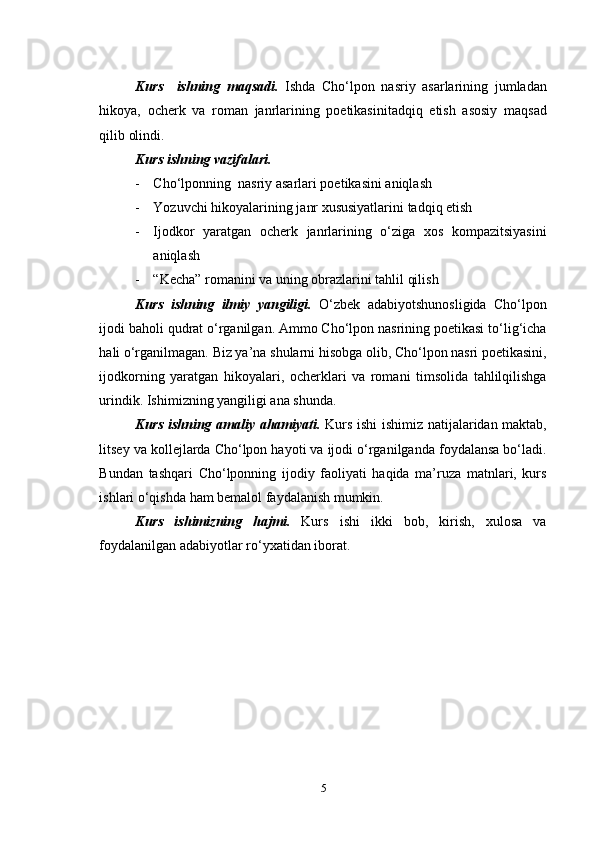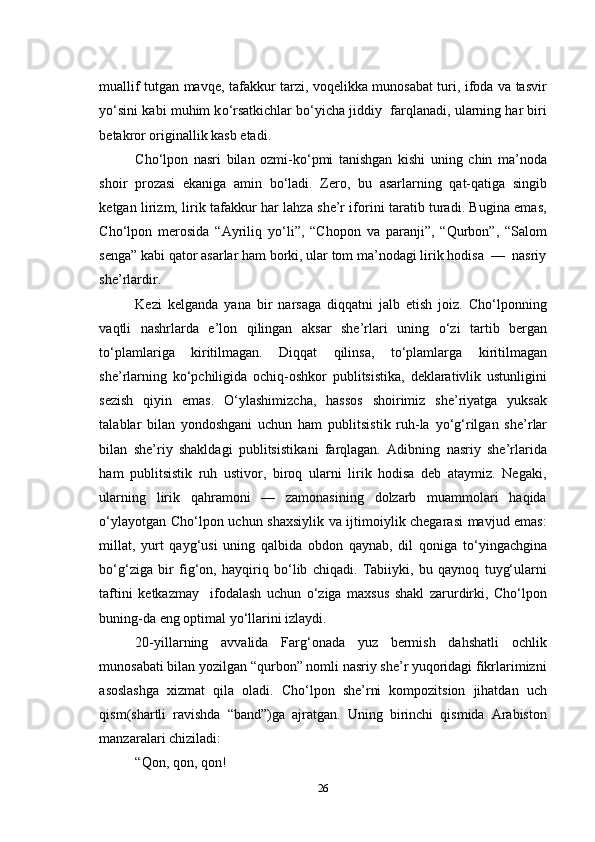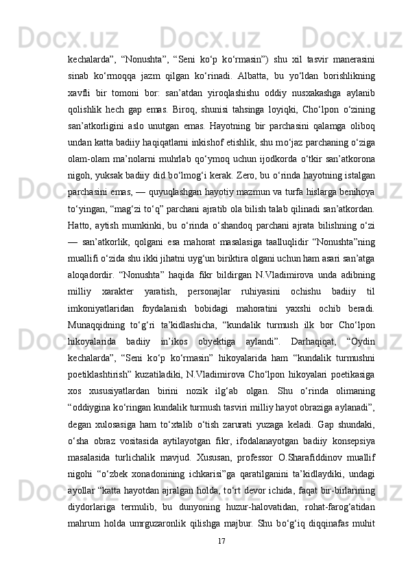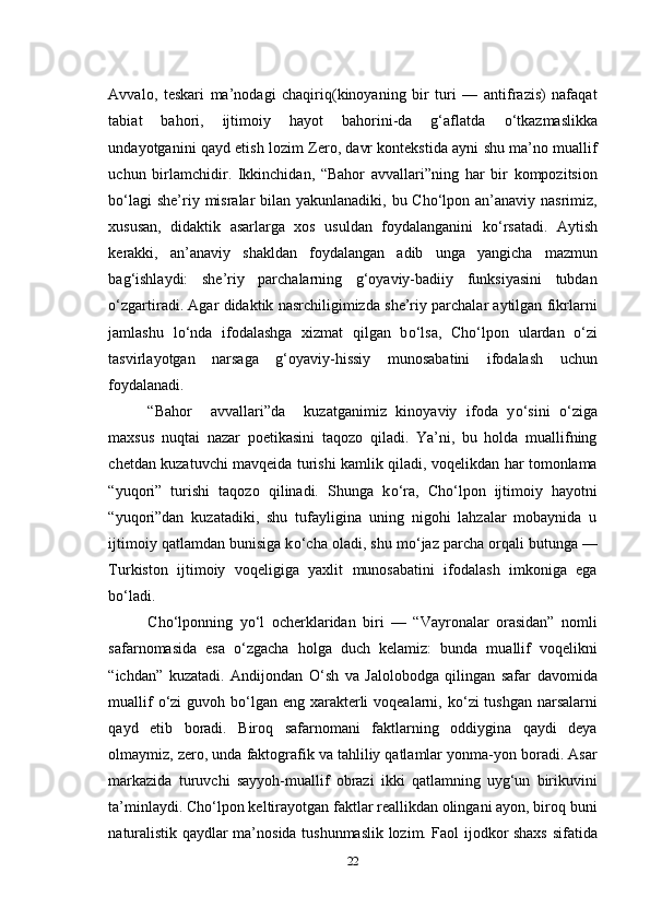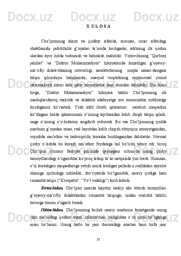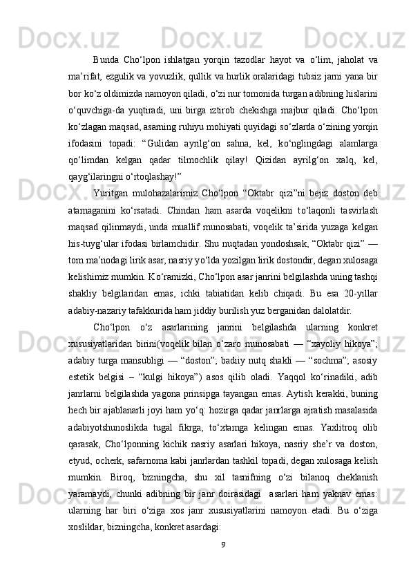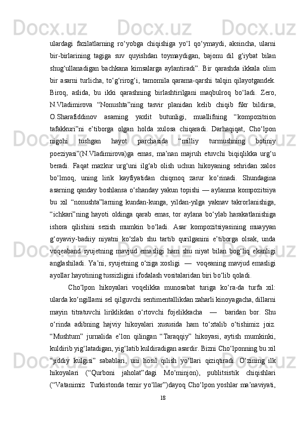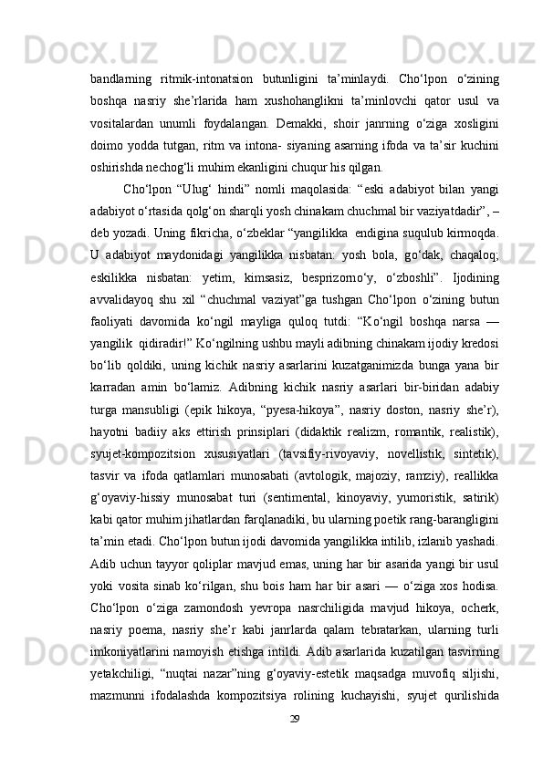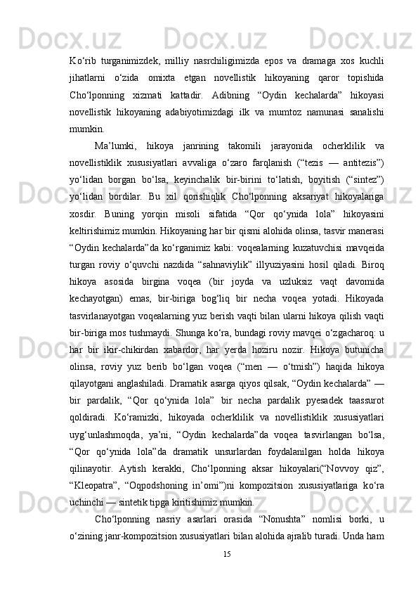 I.BOB. Cho‘lponning kichik nasriy asarlari poetikasi