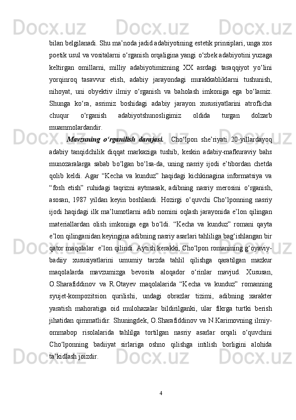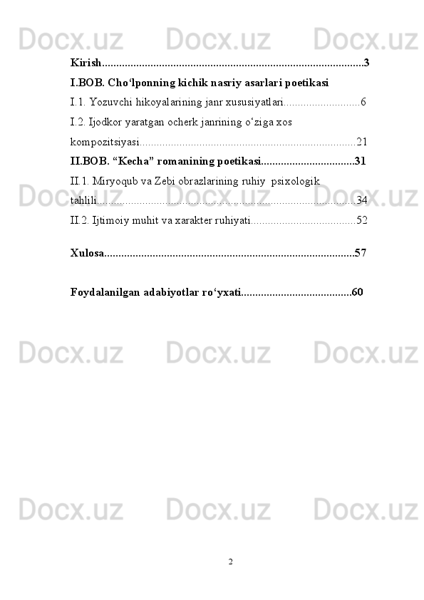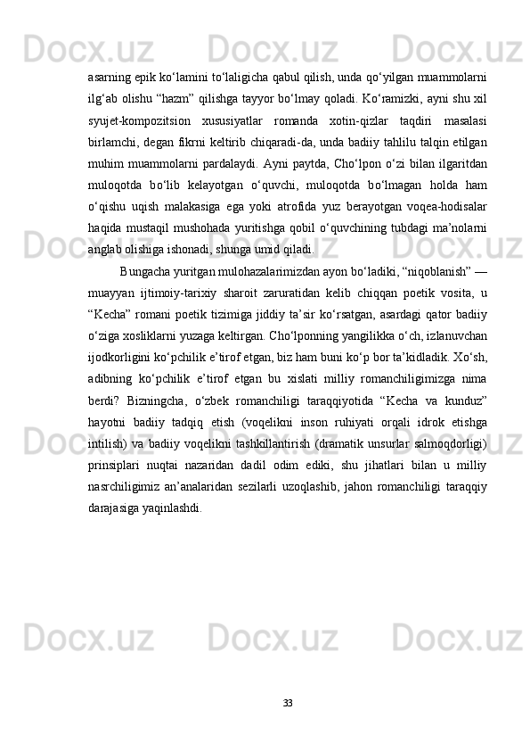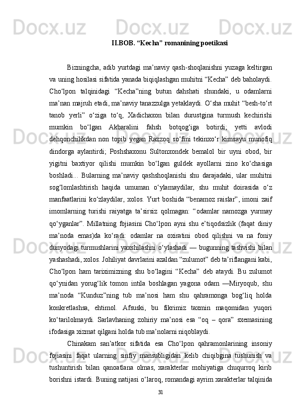 II.BOB. “Kecha” romanining poetikasi.................................31