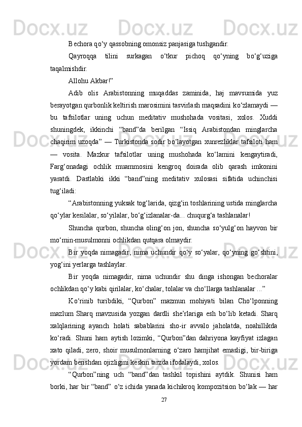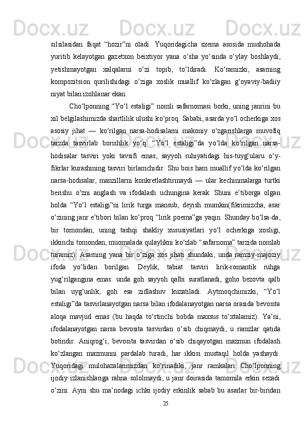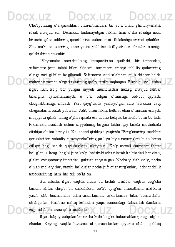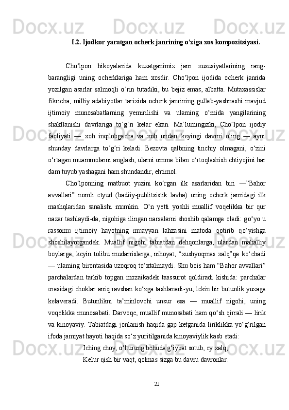 I.2. Ijodkor yaratgan ocherk janrining o‘ziga xos kompozitsiyasi............................................................................21