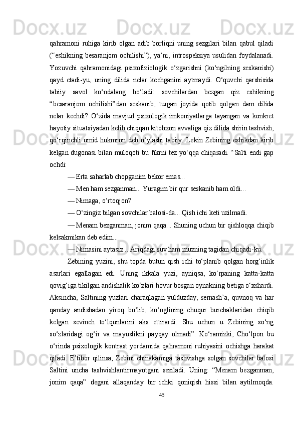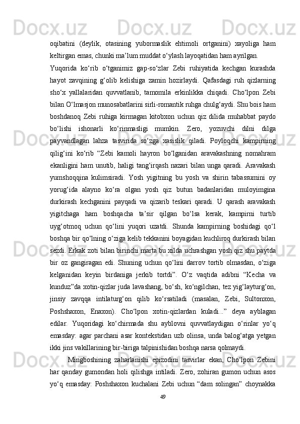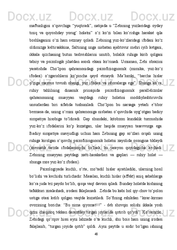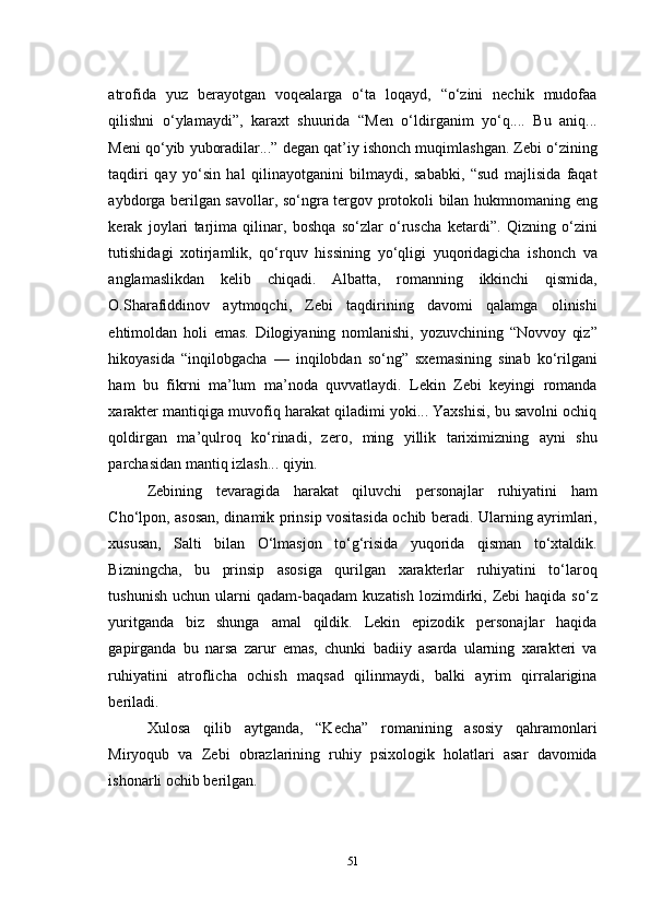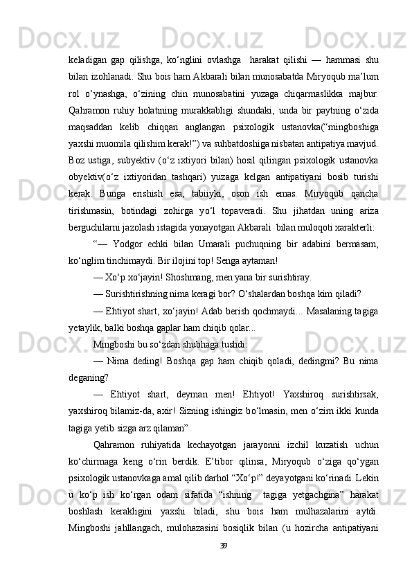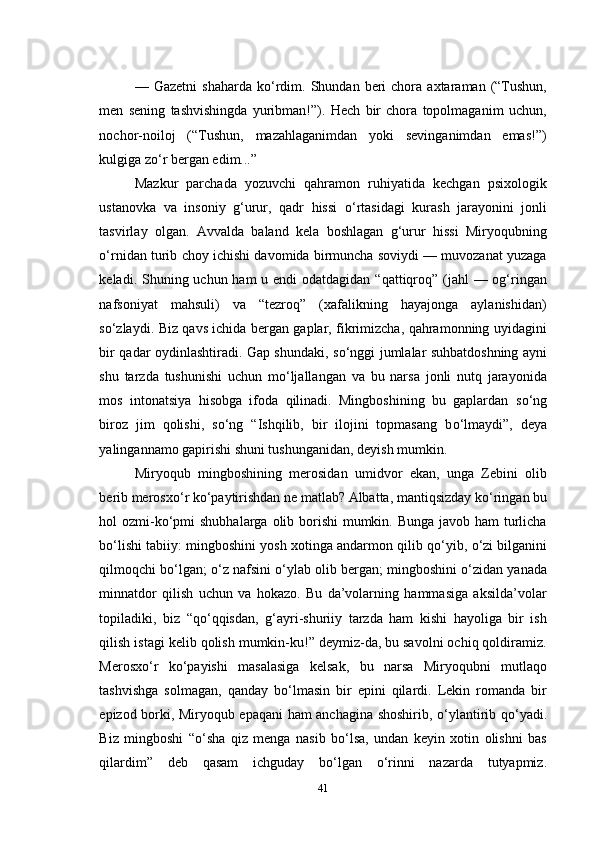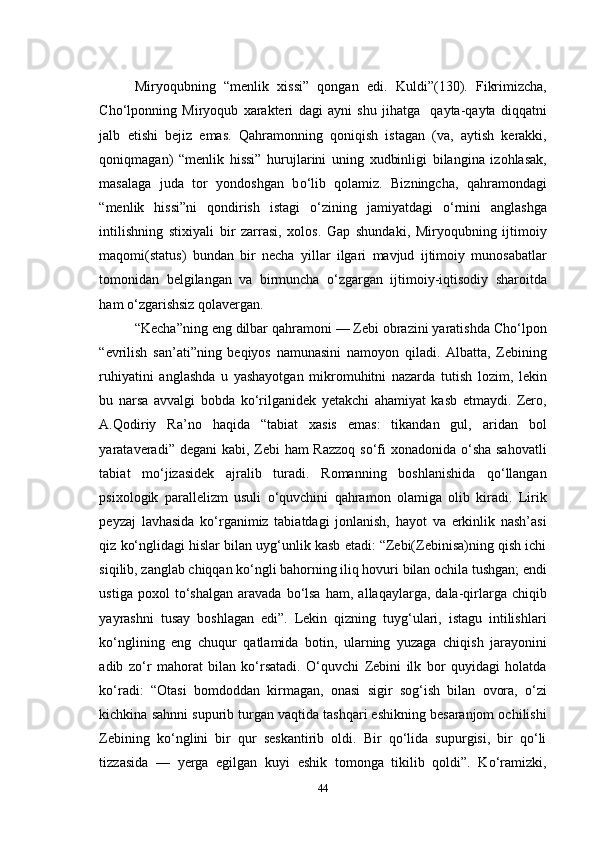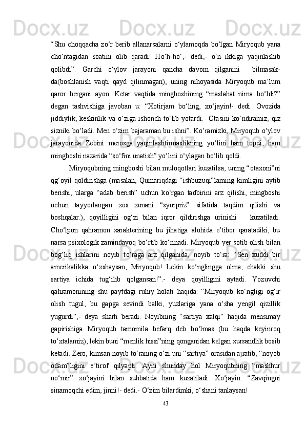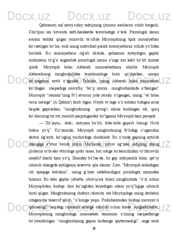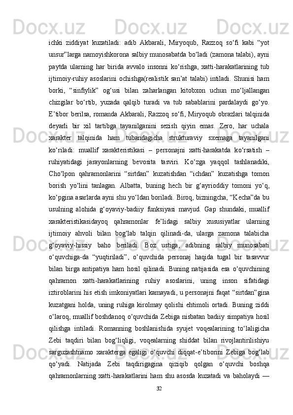 II.1. Miryoqub va Zebi obrazlarining ruhiy psixologik tahlili...........................................................................................34