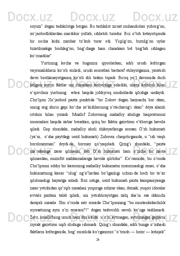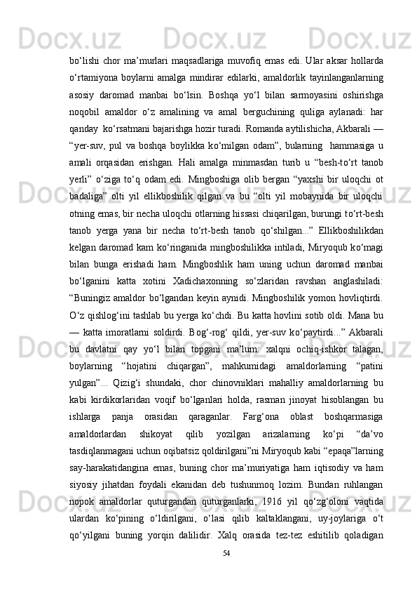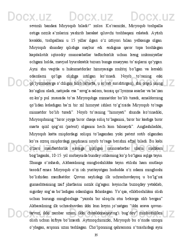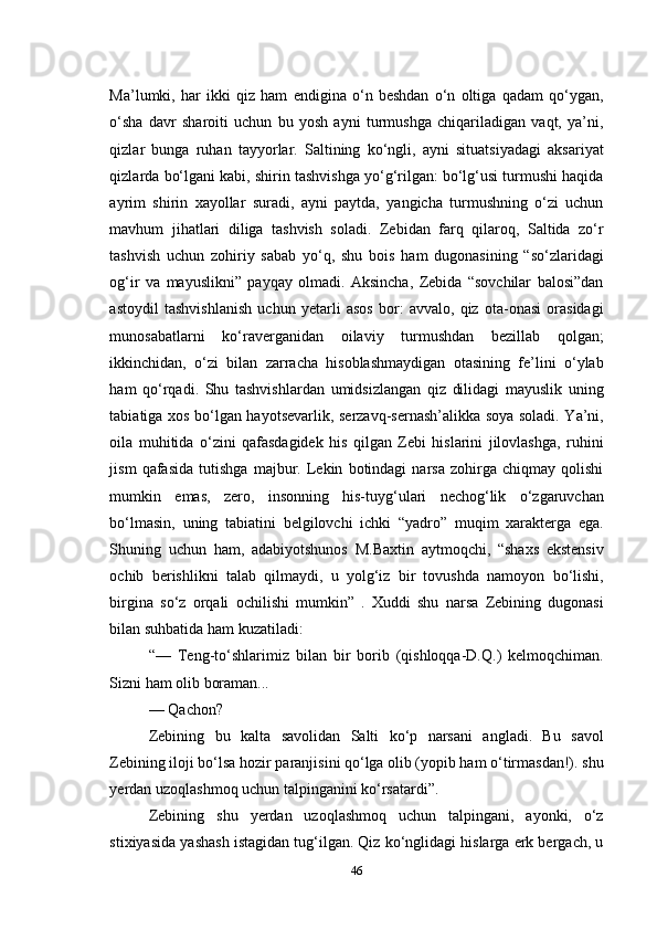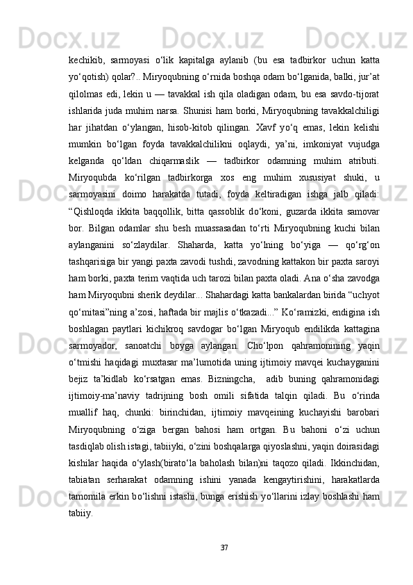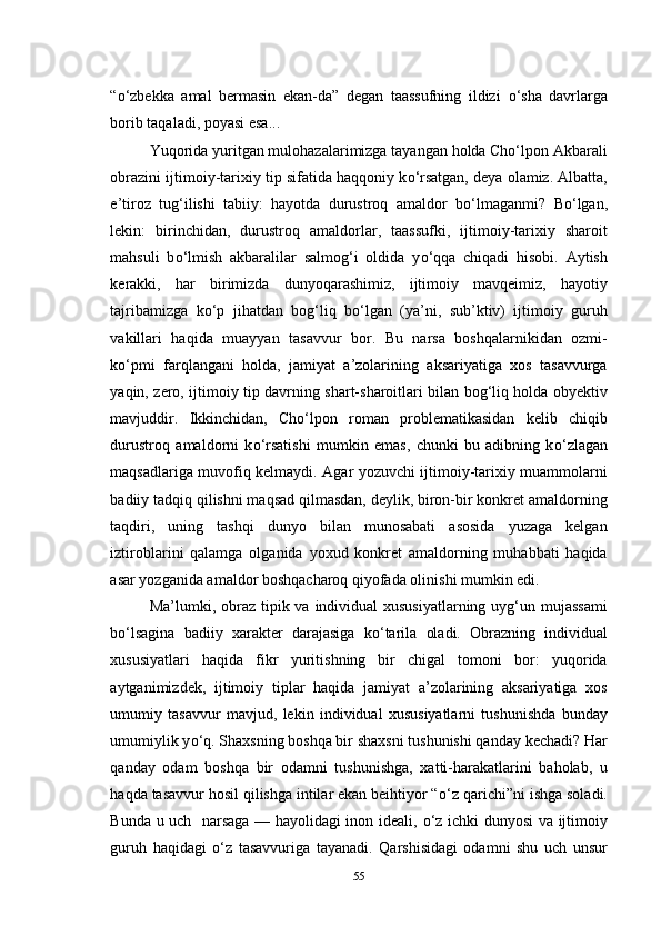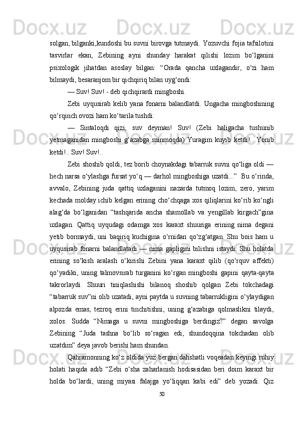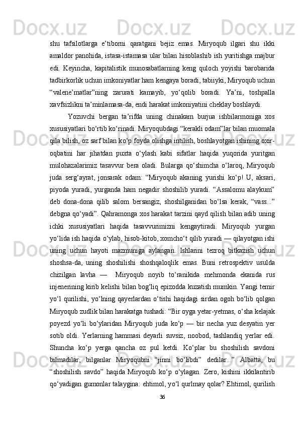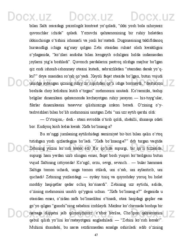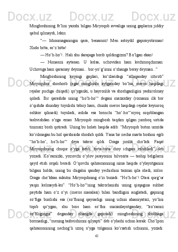 II.1. Miryoqub va Zebi obrazlarining ruhiy psixologik tahlili...........................................................................................34