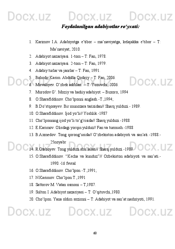 Foydalanilgan adabiyotlar ro‘yxati.......................................60