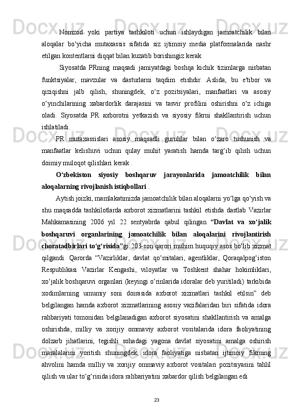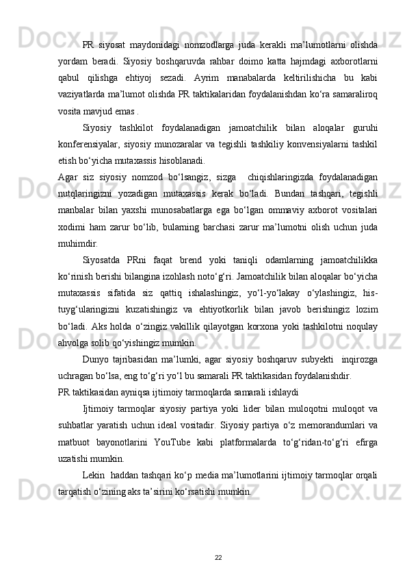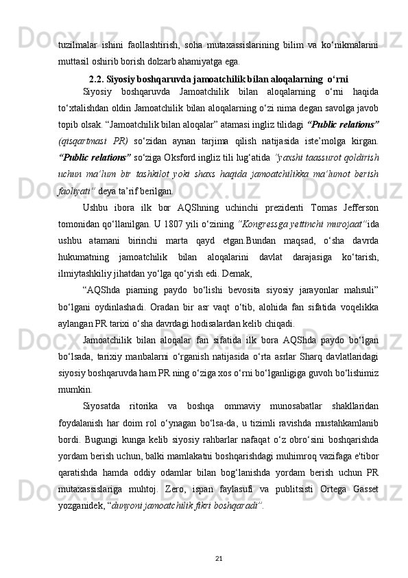 2.2. Siyosiy boshqaruvda jamoatchilik bilan aloqalarning o‘rni 21