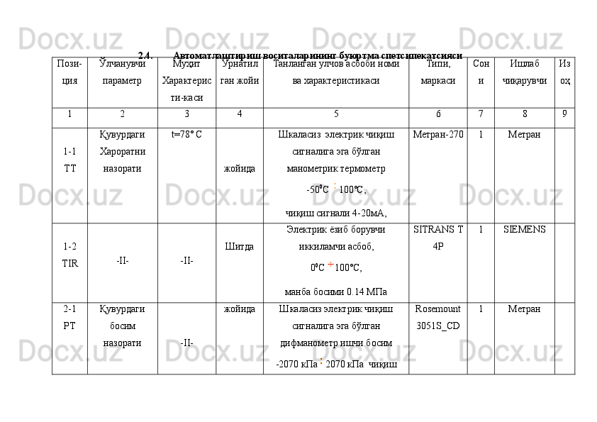 | 2.4. | Автоматлаштириш воситаларининг буюртма спетсипекатсияси | ||
