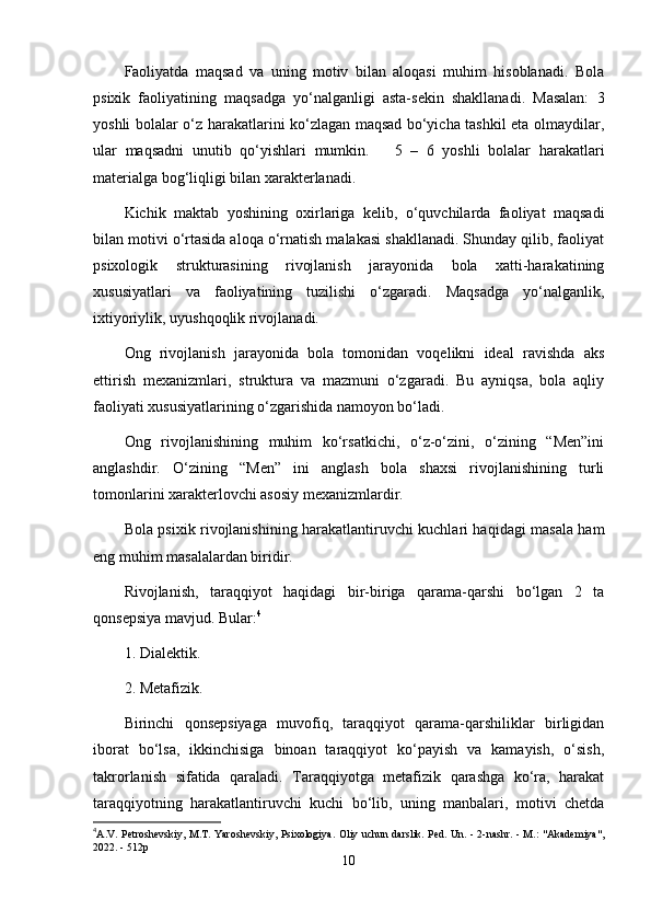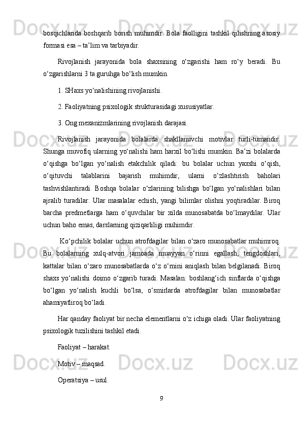 tomonidan   boshqarilishiga   bog‘liq   bo‘ladi.   Bola   faolligini   rivojlanishning   barcha