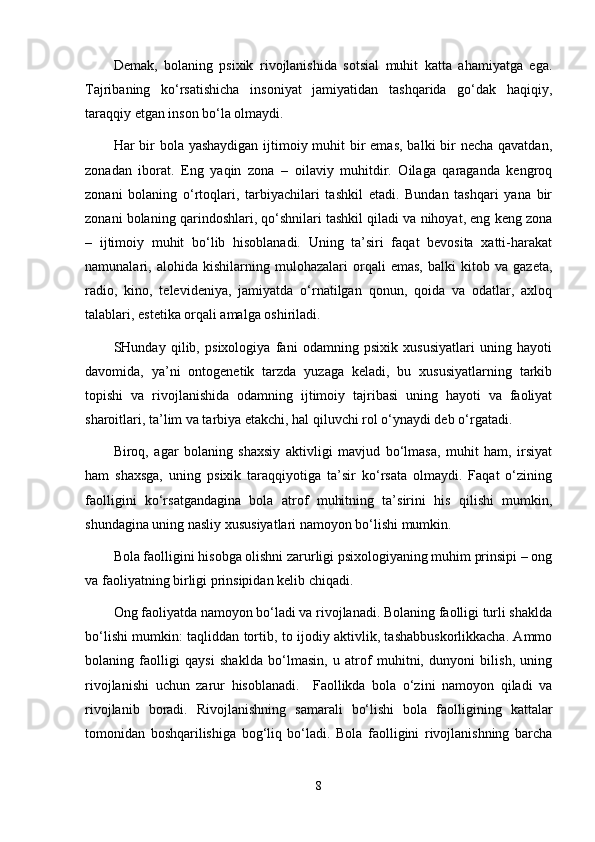 8 Bunda   bolaning   potensial   imkoniyatlari   ham   uning   psixik   taraqqiyotini