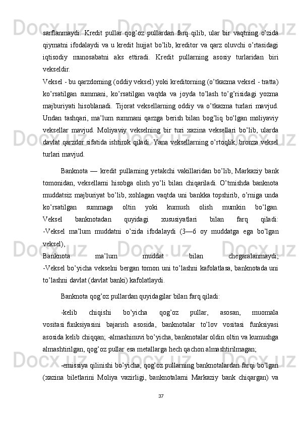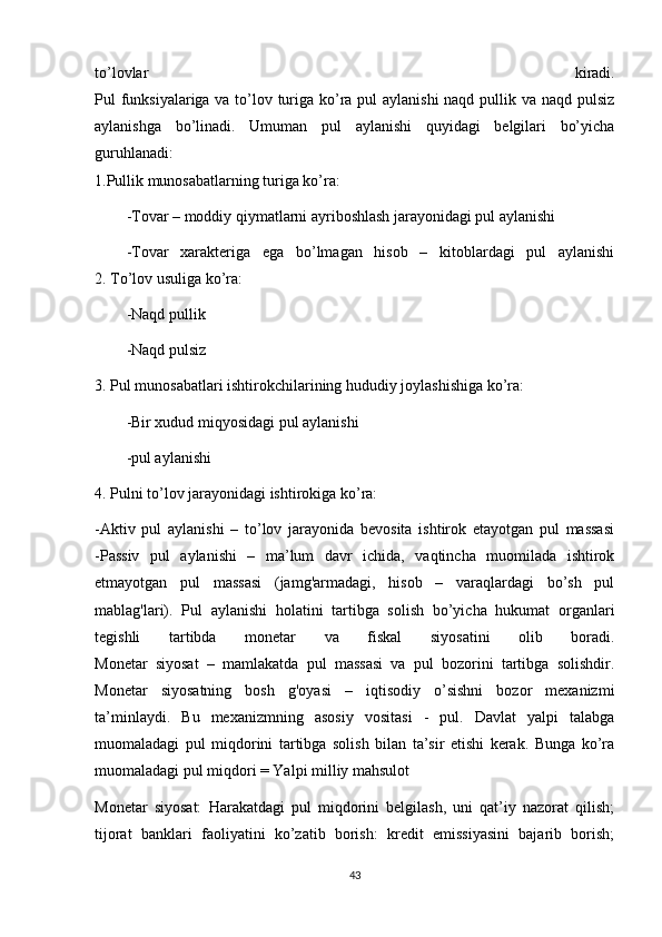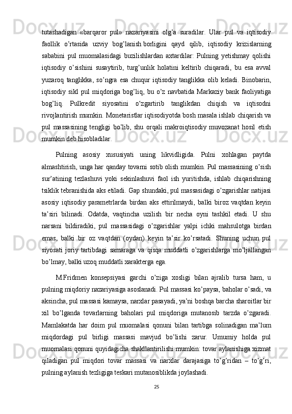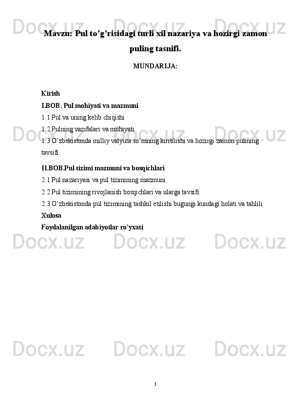 Pul to’g’risidagi turli xil nazariya va hozirgi zamon puling tasnifi