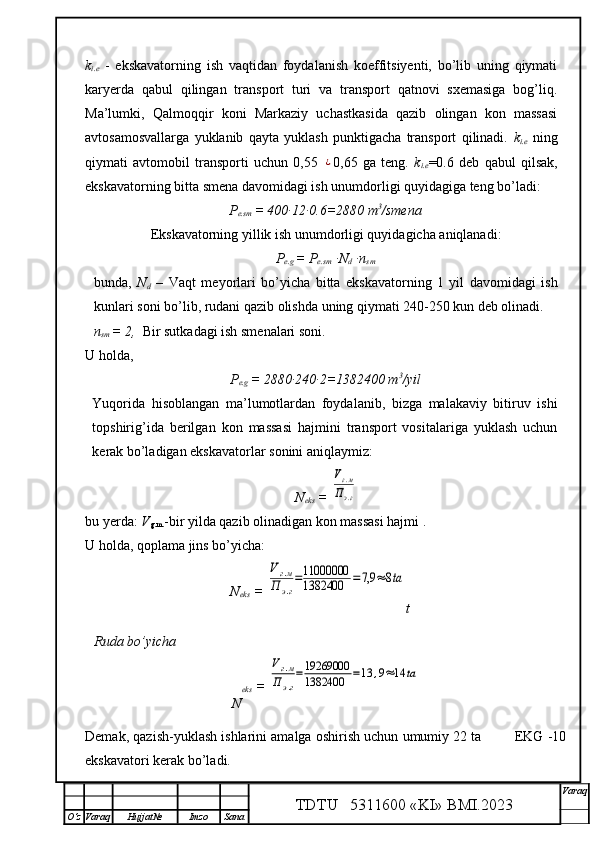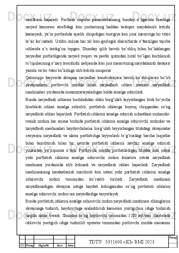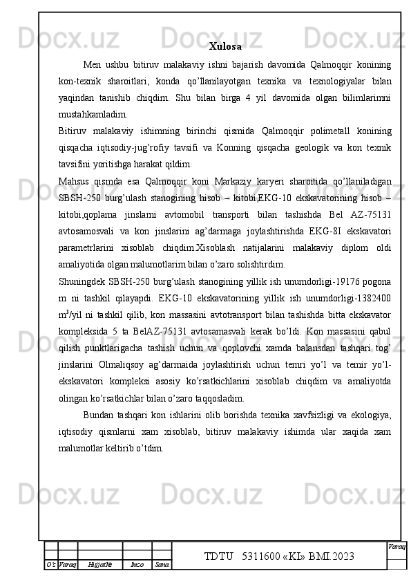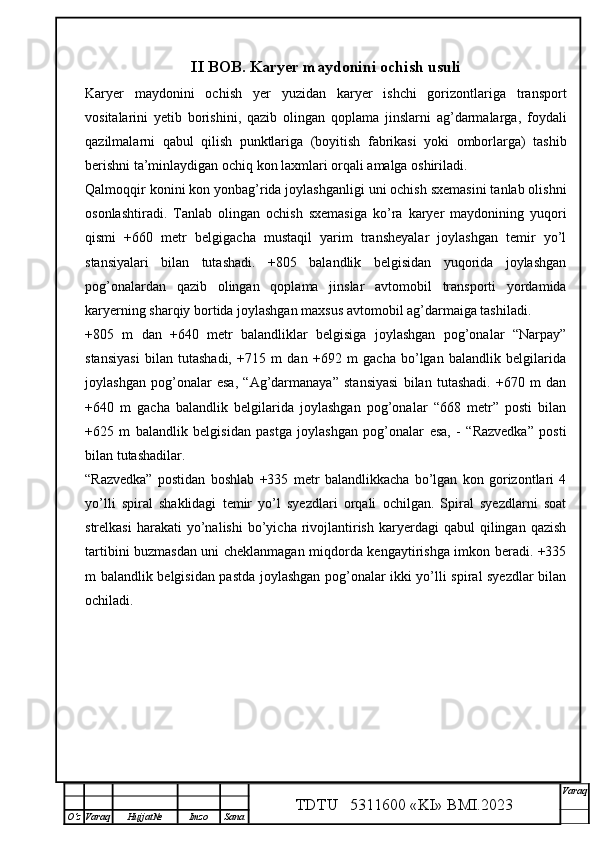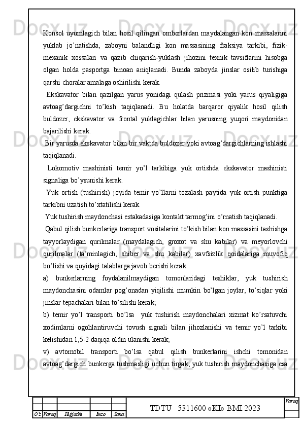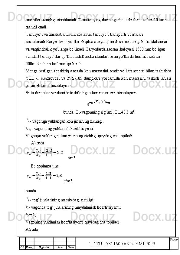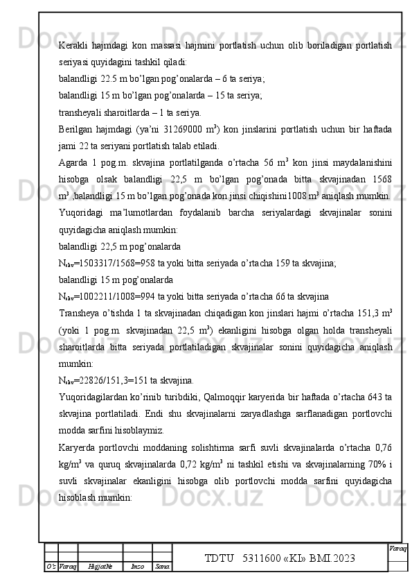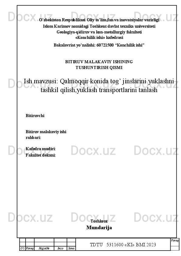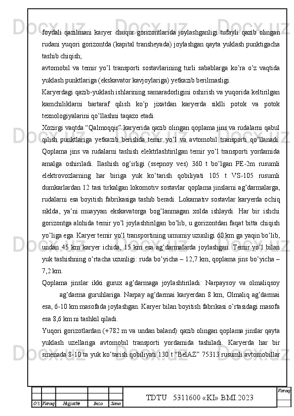 Qalmoqqir konida tog’ jinslarini yuklashni tashkil qilish,yuklash transportlarini tanlash
