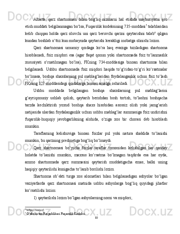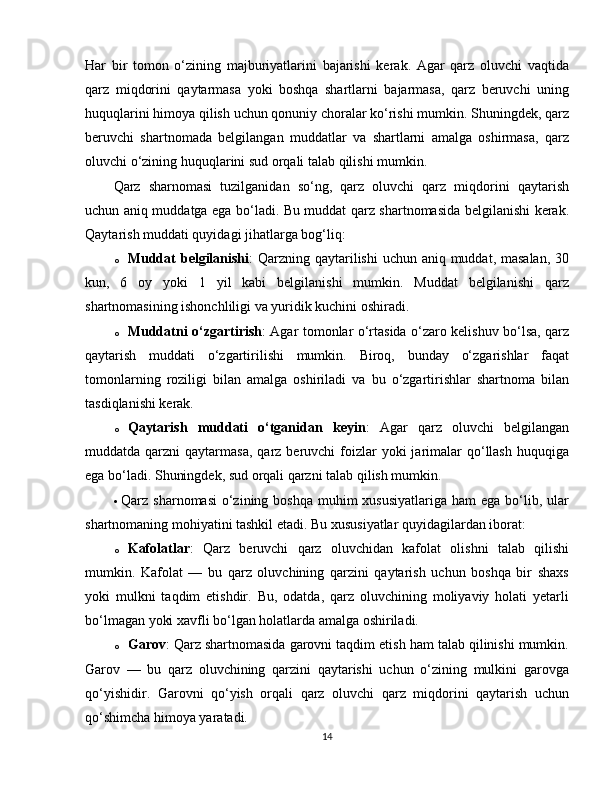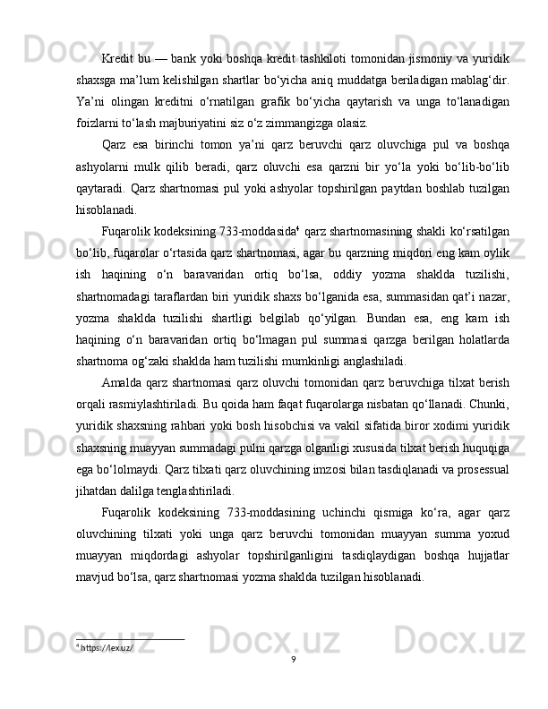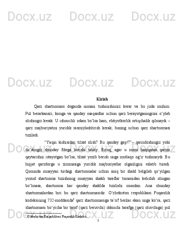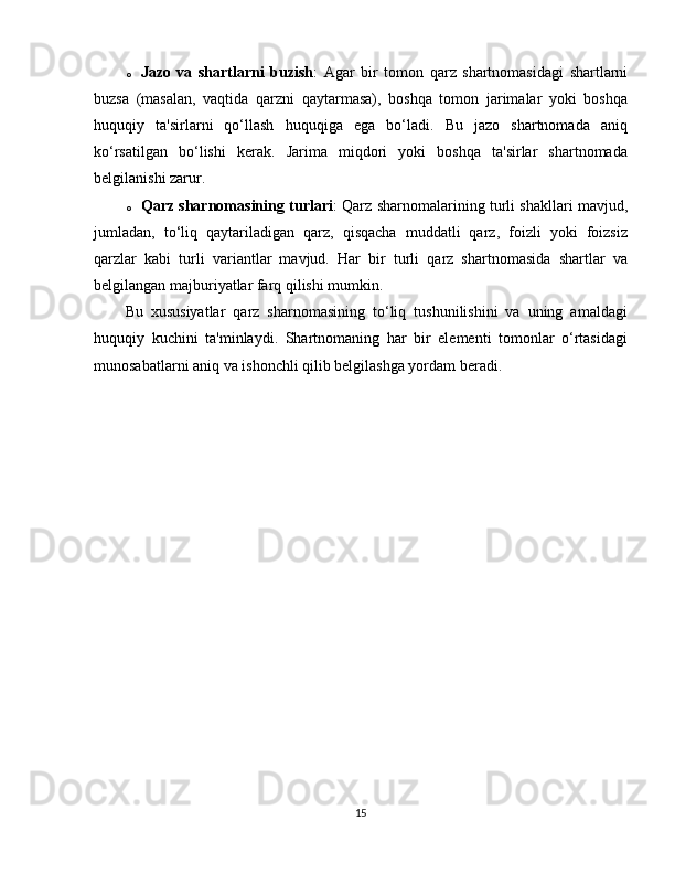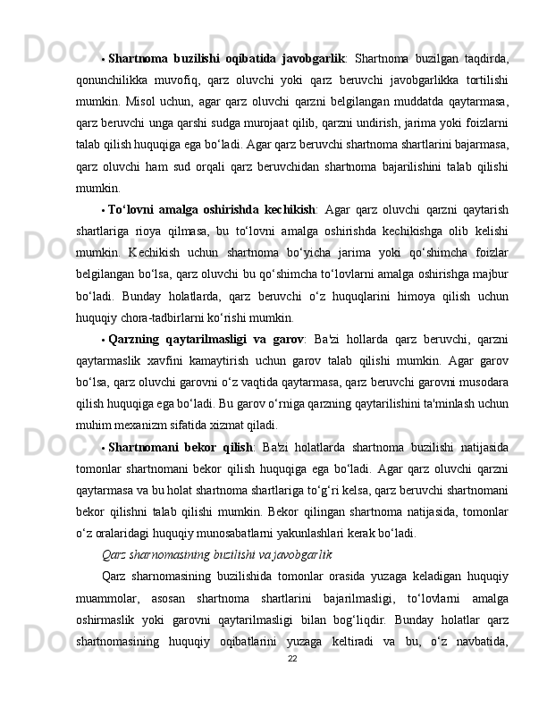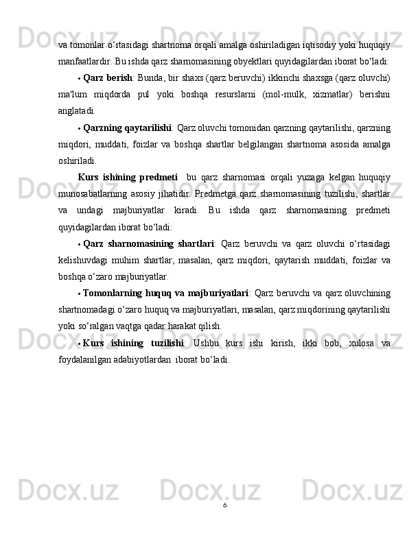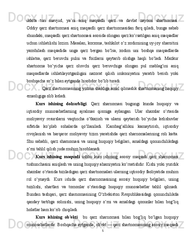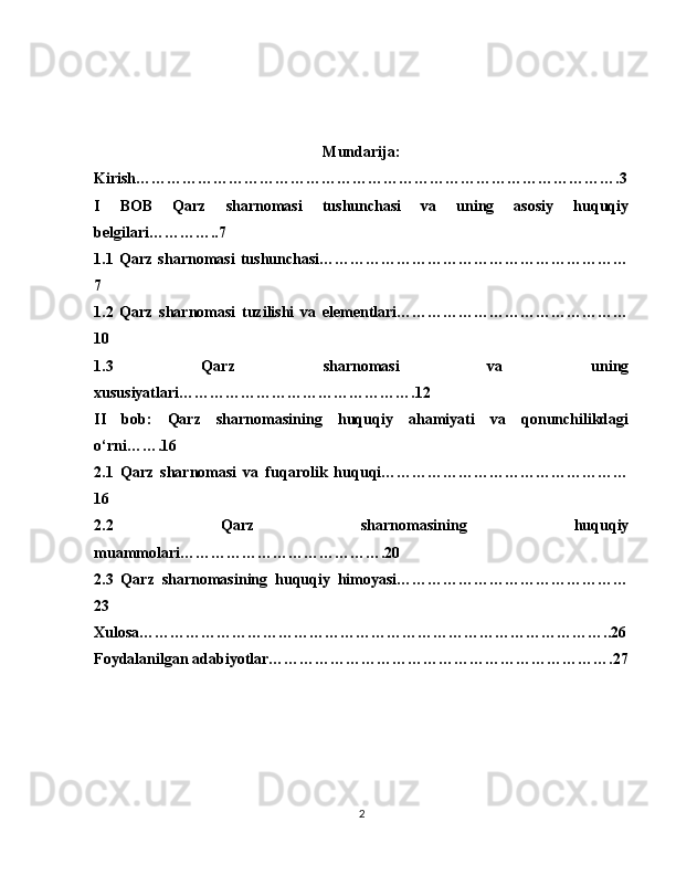 2.1 Qarz sharnomasi va fuqarolik huquqi…………………………………………16