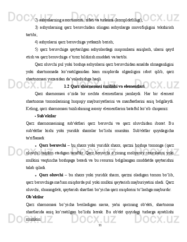 1.2 Qarz sharnomasi tuzilishi va elementlari………………………………………10
