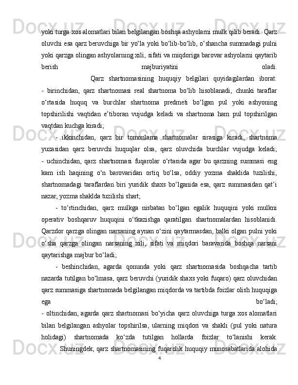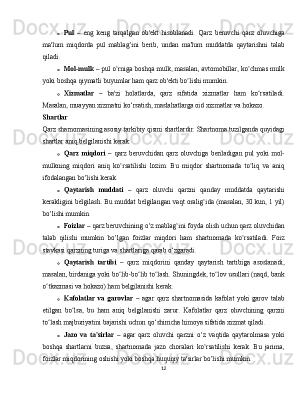1.3 Qarz sharnomasi va uning xususiyatlari……………………………………….12