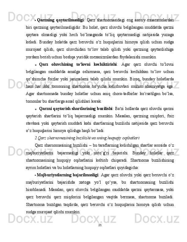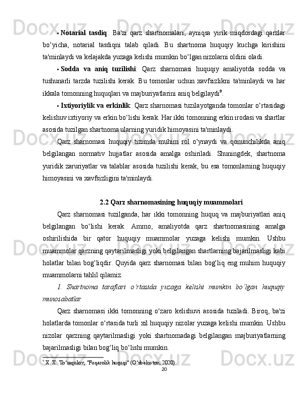 2.2 Qarz sharnomasining huquqiy muammolari………………………………….20