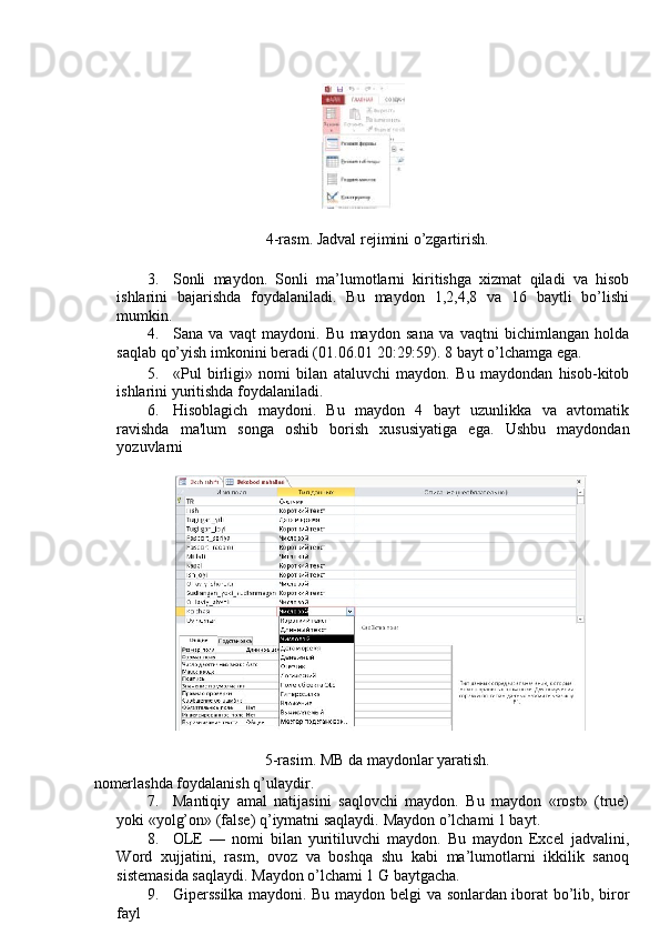 2.4. Microsoft Access dasturi. Jadvallar, formalar, so’rovlar, hisobotlar va makroslar.