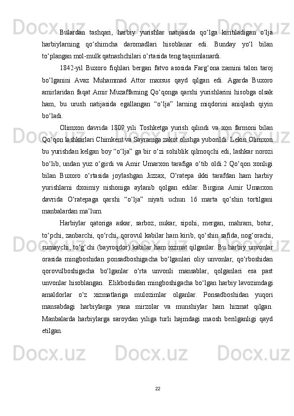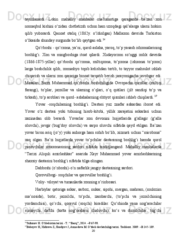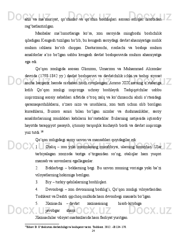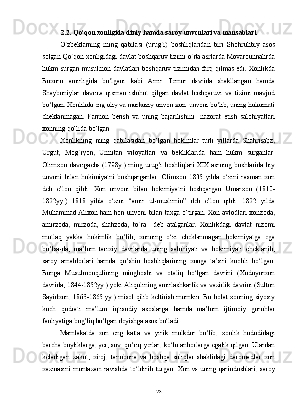2.2. Qo’qon xonligida diniy hamda saroy unvonlari va mansablari………………22