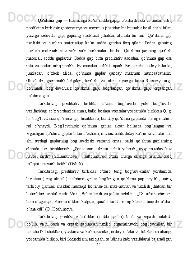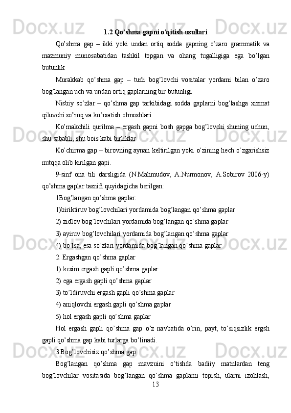1.2 Qo’shma gapni o’qitish usullari……………………………………………..11