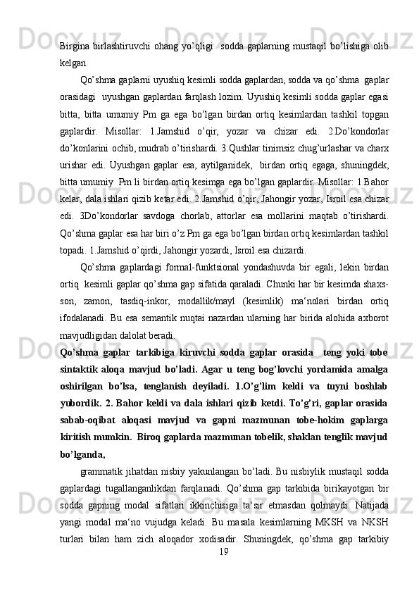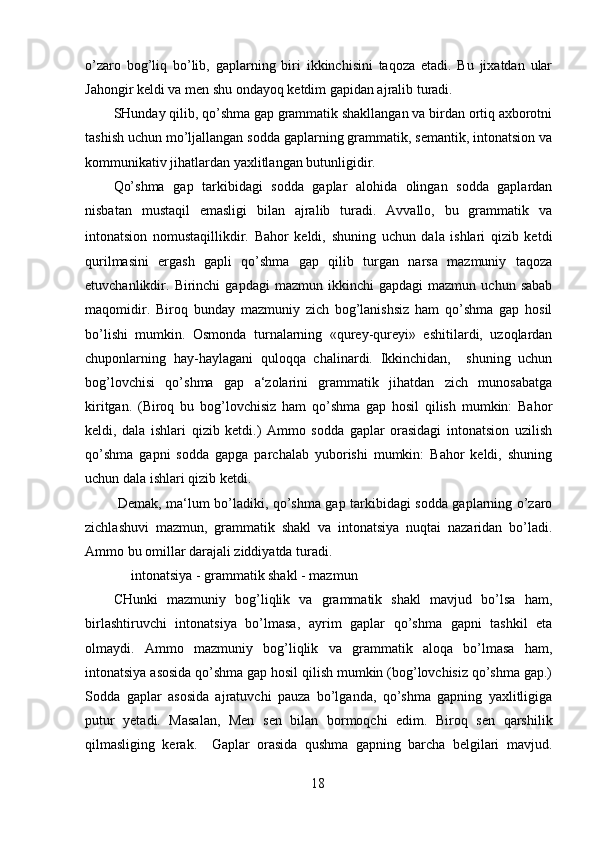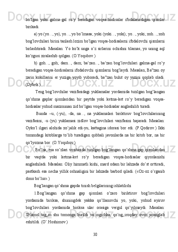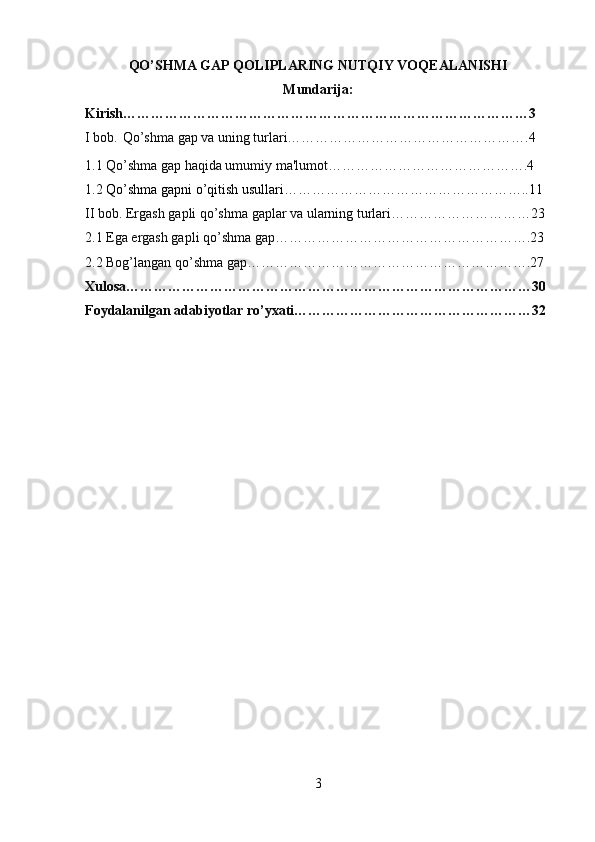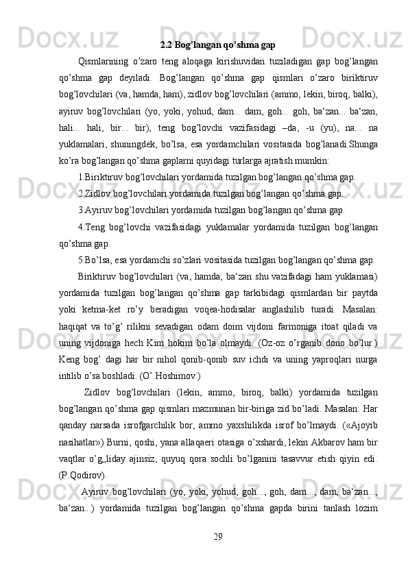 2.2 Bog’langan qo’shma gap…………………………………………………….27