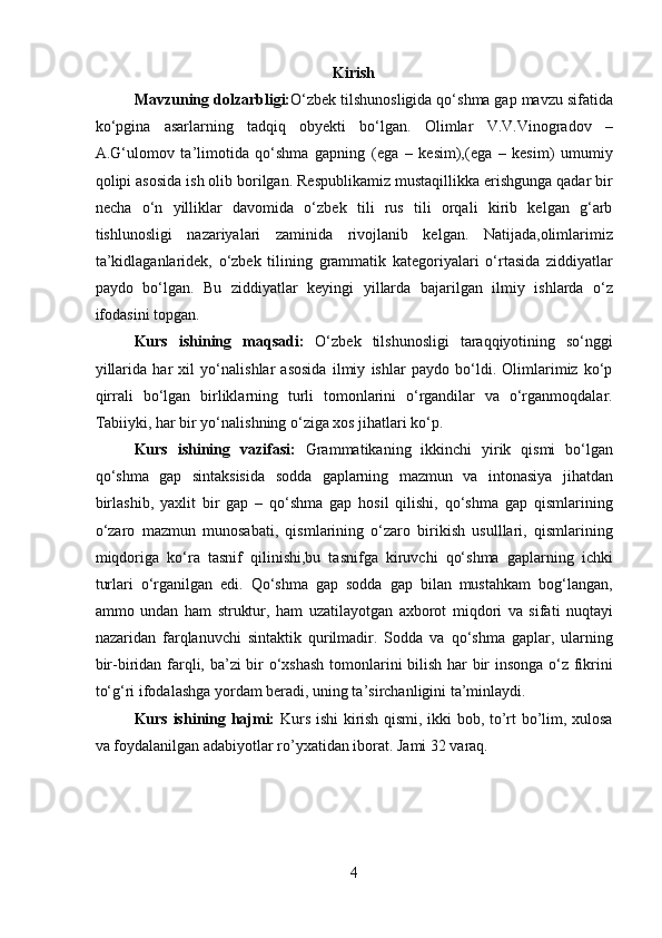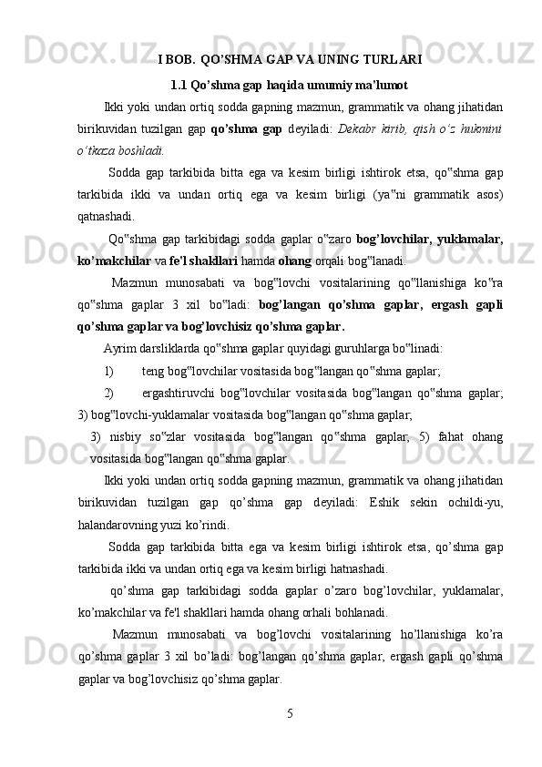 1.1 Qo’shma gap haqida umumiy ma'lumot…………………………………….4