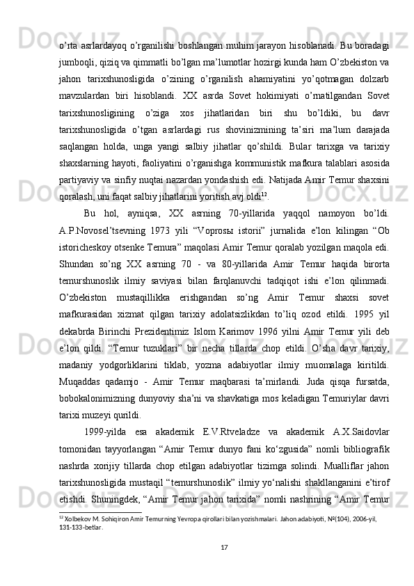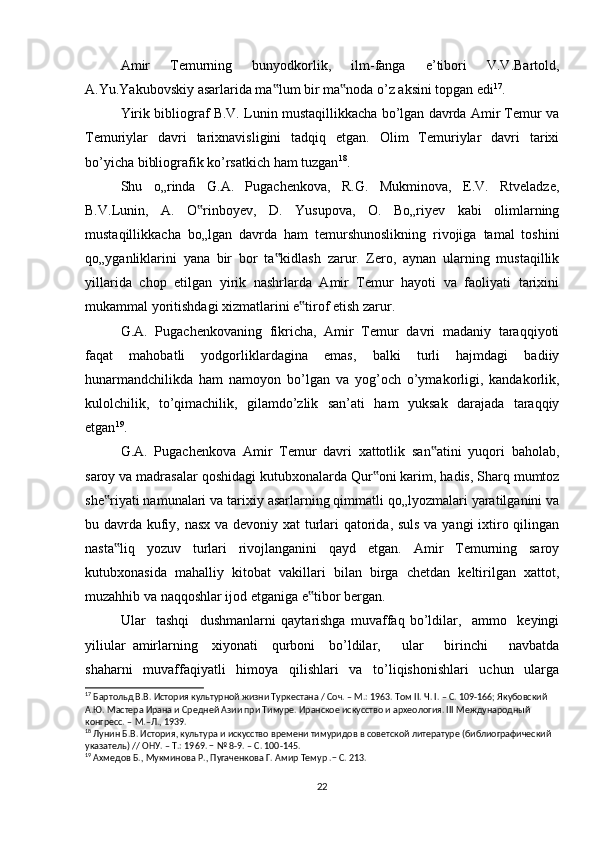 2.2 V.V. Bartold asarlarida Amir Temur davri tarixining o’rganilishi ……….. 22-26