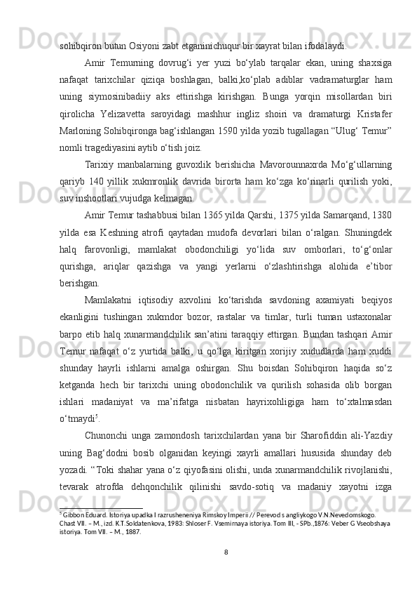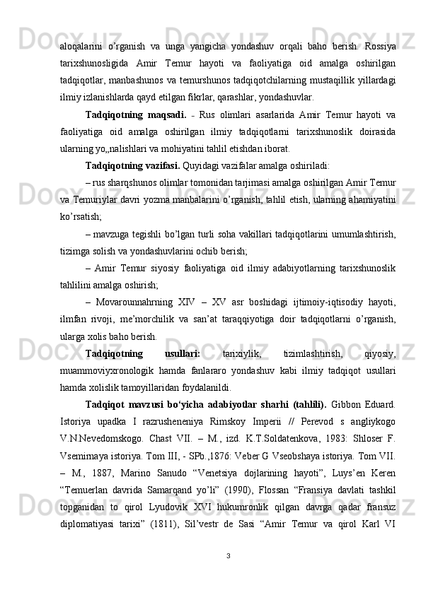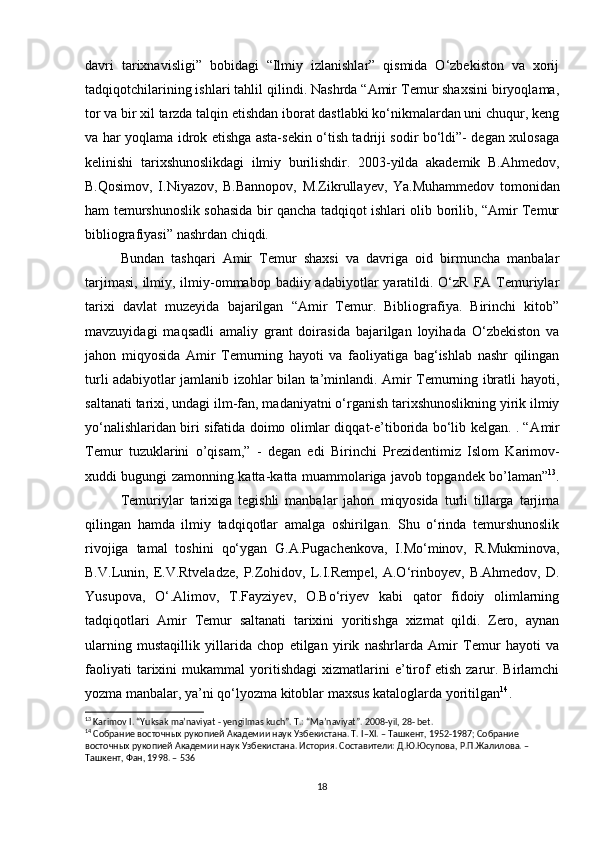 1.2. Rossiya tarixchilarining Amir Temur davrini tadqiq etishi ......................... 11-15