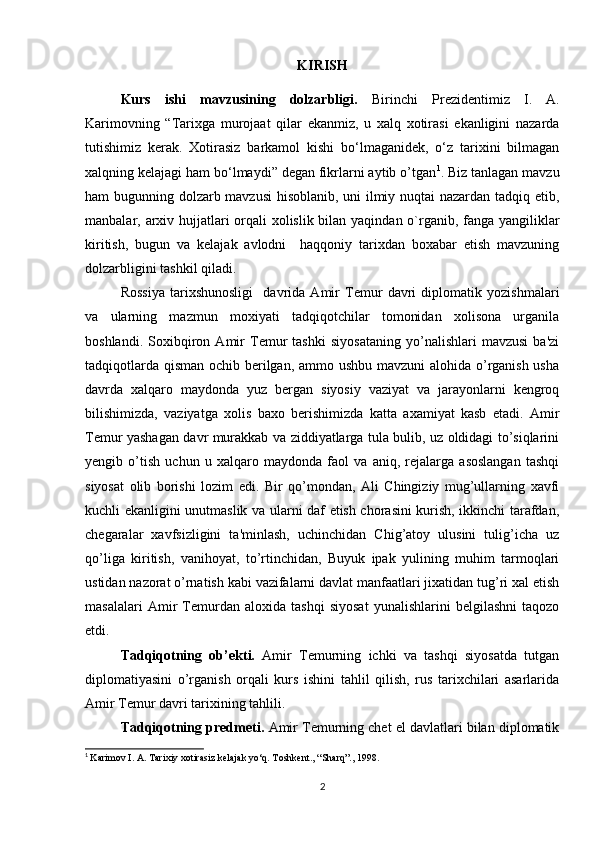 I BOB. ROSSIYA TARIXSHUNOSLIGIDA AMIR TEMUR DAVRI TARIXINING O’RGANILISHI