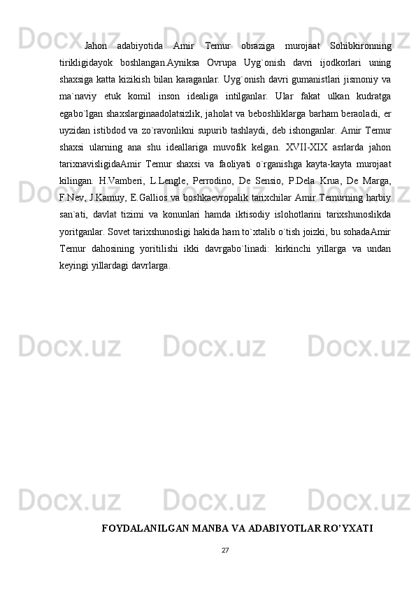 2.1 Amir Temurning jahon tarixshunosligida tutgan o’rni va roli ……………. 16-21
