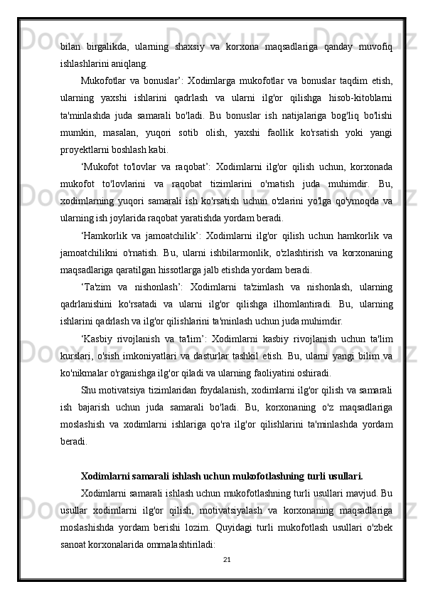 Motivatsiya   va   mukofotlar:   Xodimlarni   boshqarishda,   ularga   yaxshi