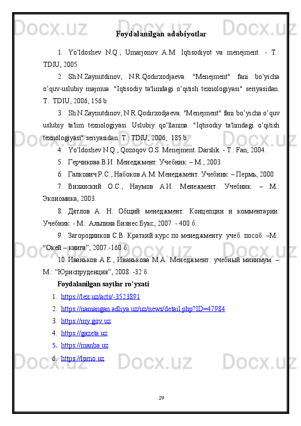 2. Sh.N.Zaynutdinov,   N.R.Qodirxodjaeva.   "Menejment"   fani   bo’yicha