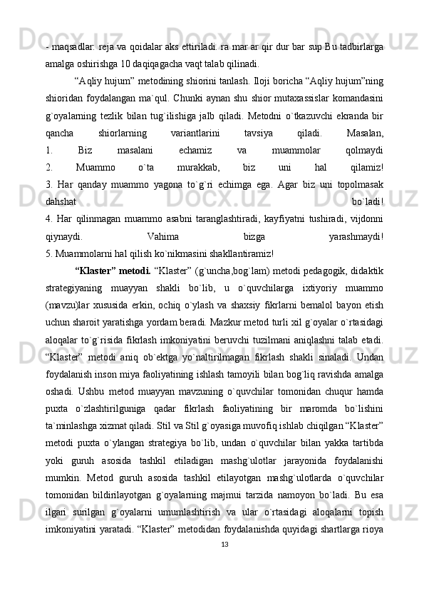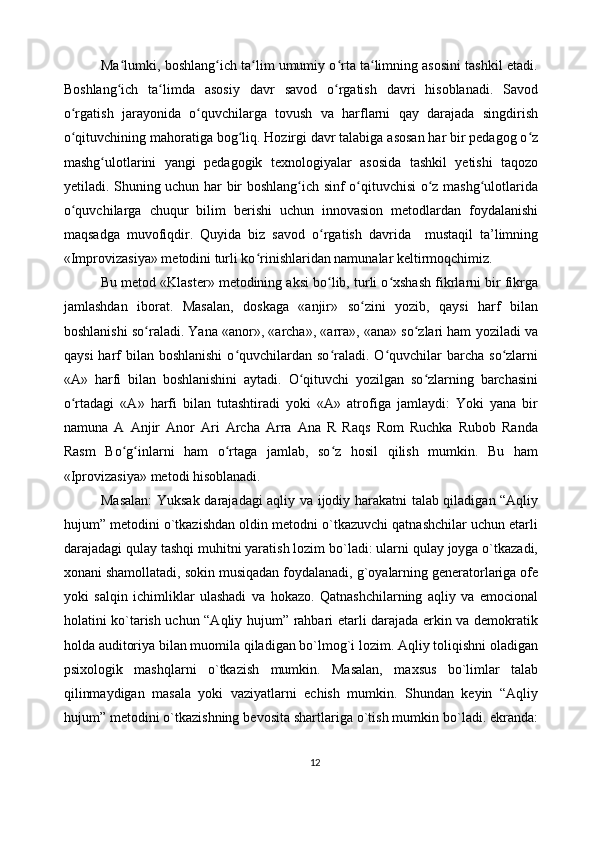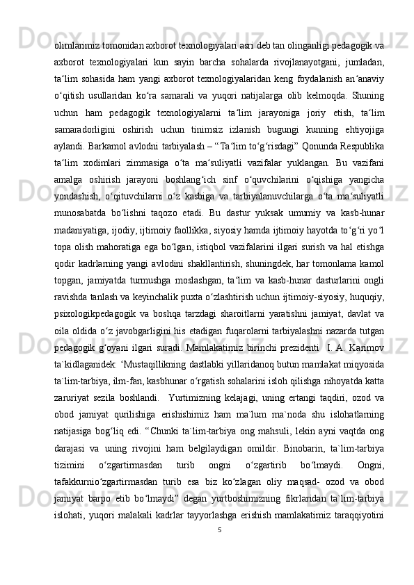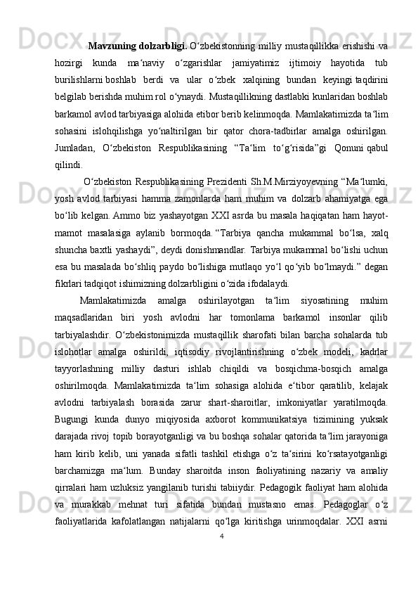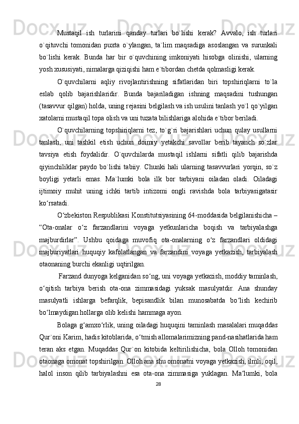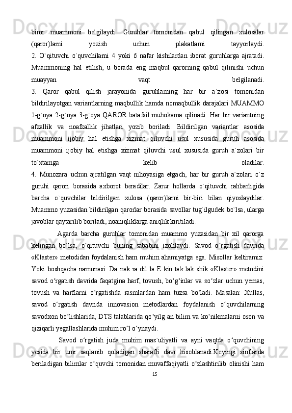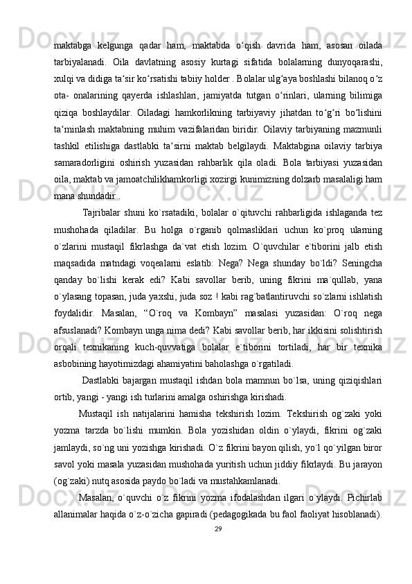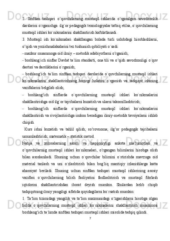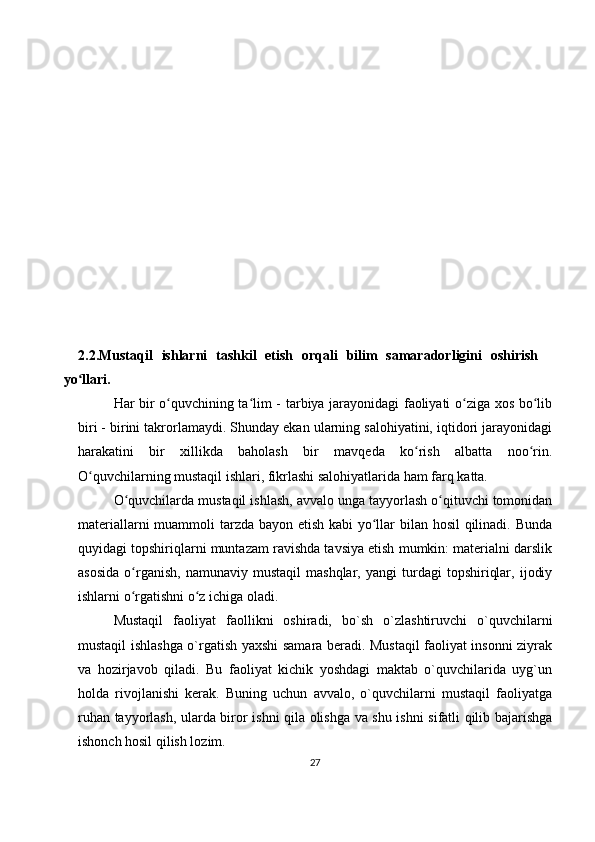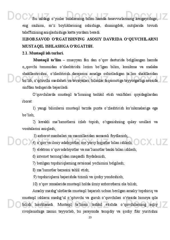 2.2. Mustaqil ishlarni tashkil etish orqali bilim samaradorligini oshirish yoʻllari......................................................................................................23-26