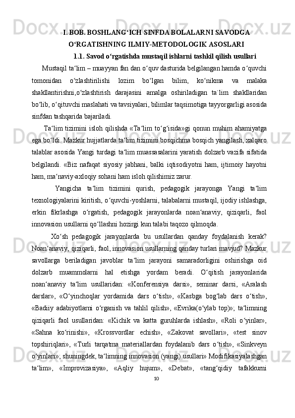 I. BOB. BOSHLANGʻICH SINFDA BOLALARNI SAVODGA OʻRGATISHNING ILMIY-METODOLOGIK ASOSLARI