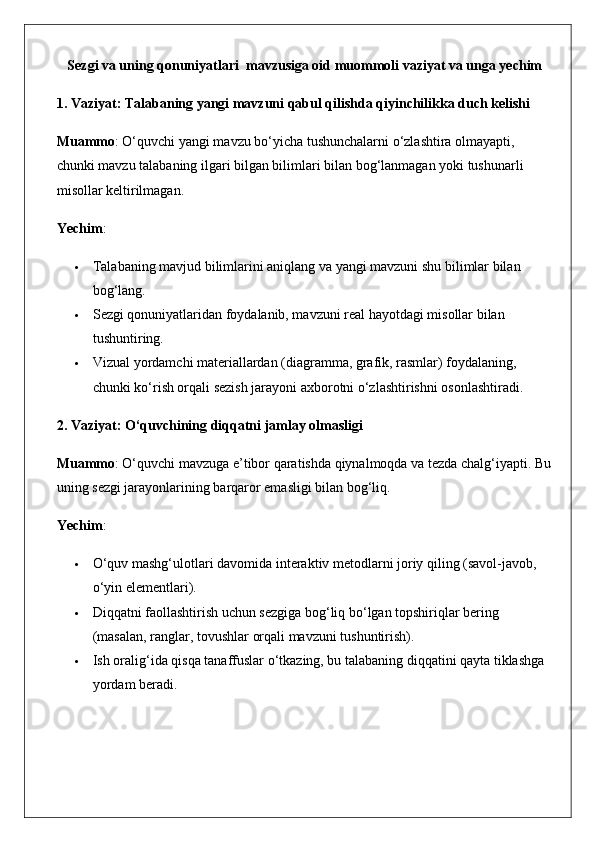 Sezgi va uning qonuniyatlari mavzusiga oid muommoli vaziyat va unga yechim