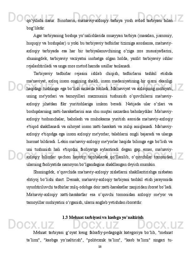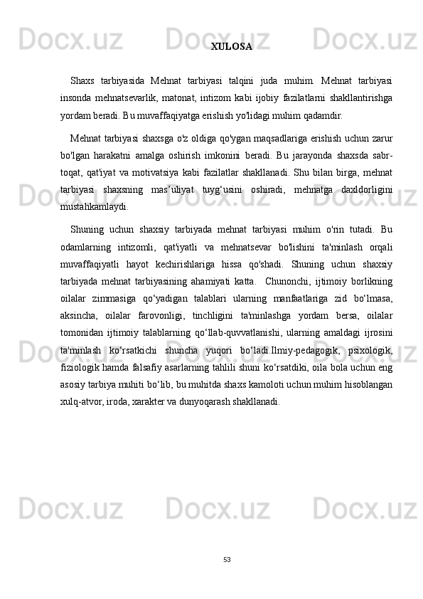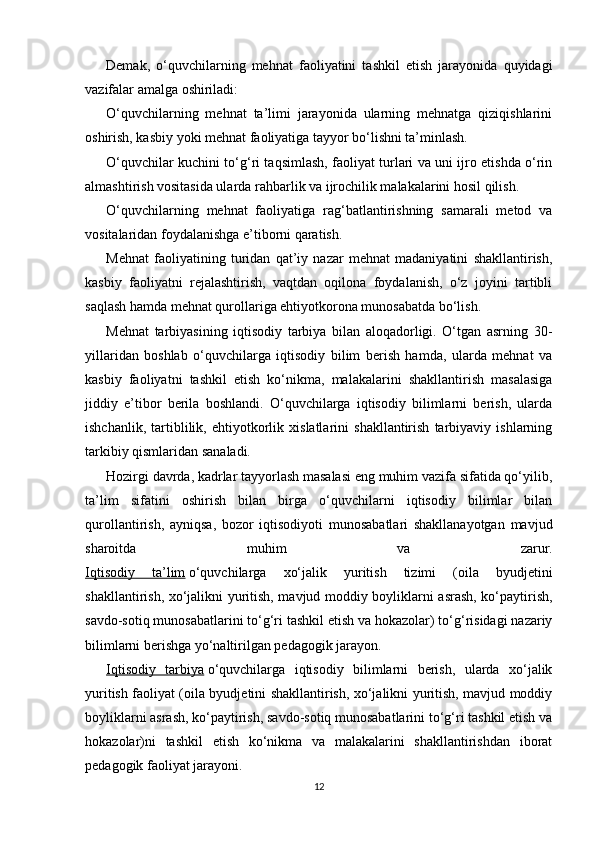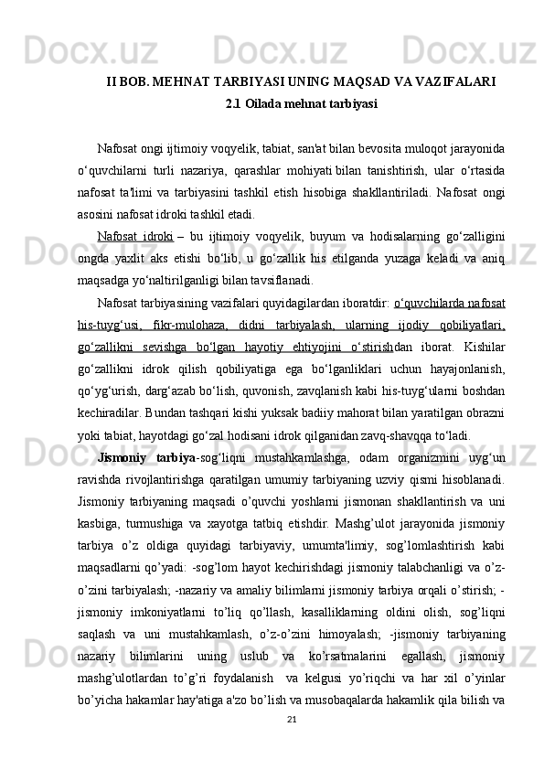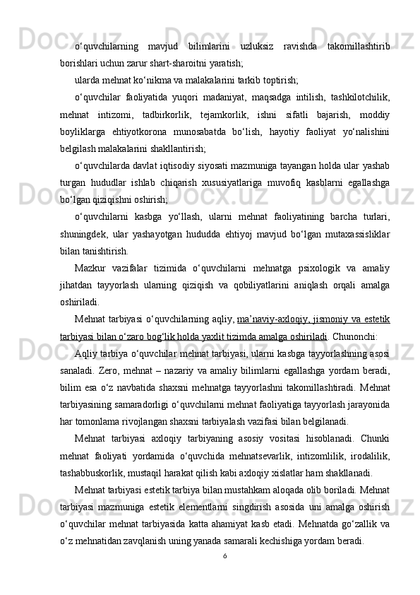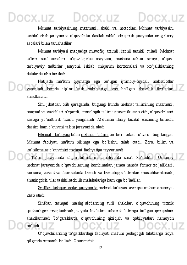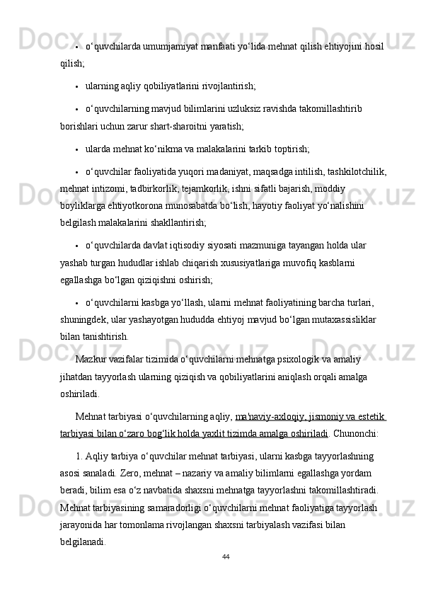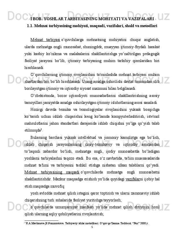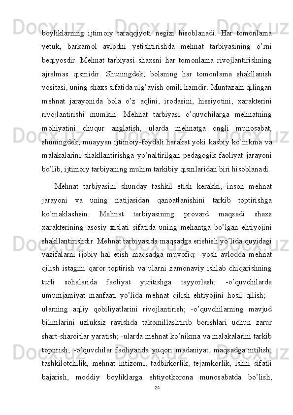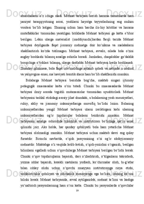 Mehnat tarbiyasi g`oyat keng falsafiy-pedagogik kategoriya bo`lib, «mehnat ta’limi», «kasbga yo`naltirish», «politexnik ta’lim», «kasb ta’limi» singari tu-shunchalarni o`z ichiga oladi. Mehnat tarbiyasi berish hamma zamonlarda ham jamiyat taraqqiyotining asosi, yoshlarni hayotga tayyorlashning eng muhim vositasi bo`lib kelgan. Shuning uchun ham barcha ilohiy kitoblar va hamma mutafakkirlar tomonidan yaratilgan bitiklarda Mehnat tarbiyasiga katta e’tibor berilgan. Lekin ularga materialist (moddiyunchi) lardan farqli tarzda Mehnat tarbiyasi deyilganda faqat jismoniy mehnatga doir ko`nikma va malakalarni shakllantirish ko`zda tutilmagan. Mehnat tarbiyasi, avvalo, oilada bola o`zini anglay boshlashi bilanoq amalga oshirila boradi. Jumladan, chaqaloklar go`daklik bosqichiga o`tishlari bilanoq, ularga dastlabki Mehnat tarbiyasi berila boshlanadi. Shunday qilinmasa, bola faqat iste’molchiga aylanib qoladi va natijada u noshud va yalqovgina emas, ma’naviyati kemtik shaxs ham bo`lib shakllanishi mumkin.Bolalarga Mehnat tarbiyasi berishda bog`cha, maktab singari ijtimoiy pedagogik muassasalar katta o`rin tutadi.