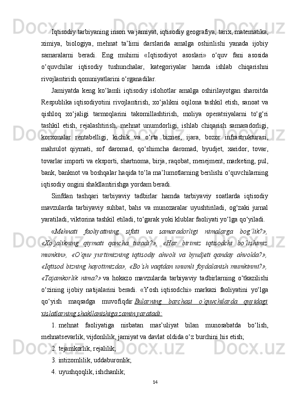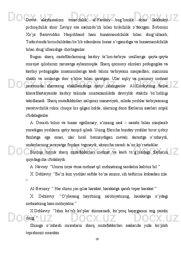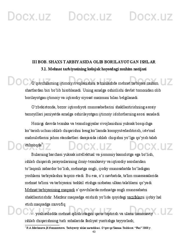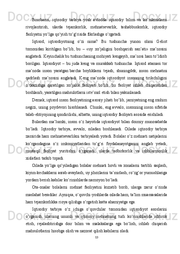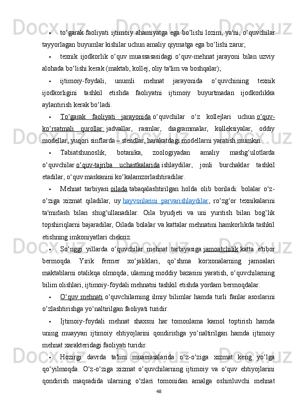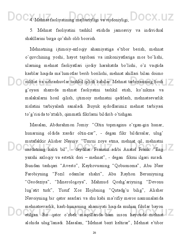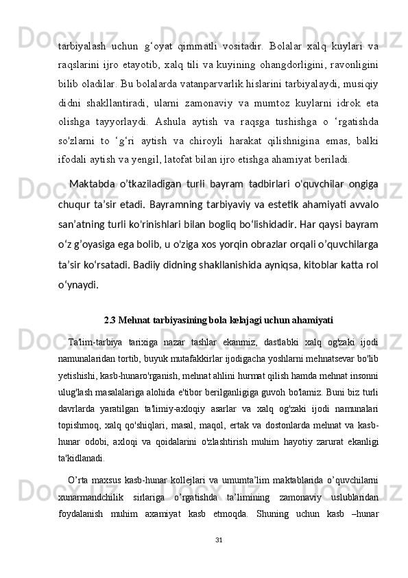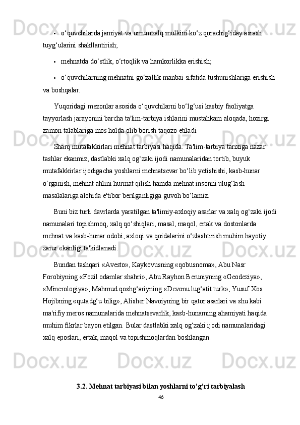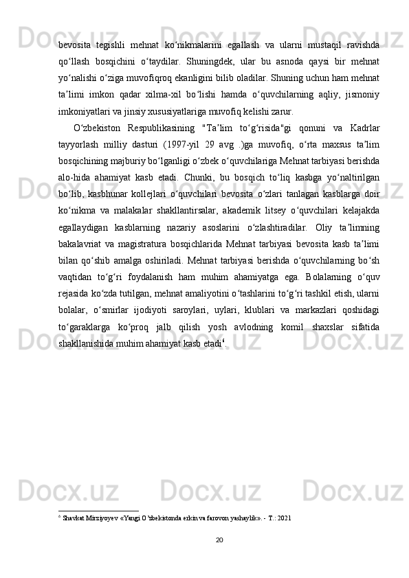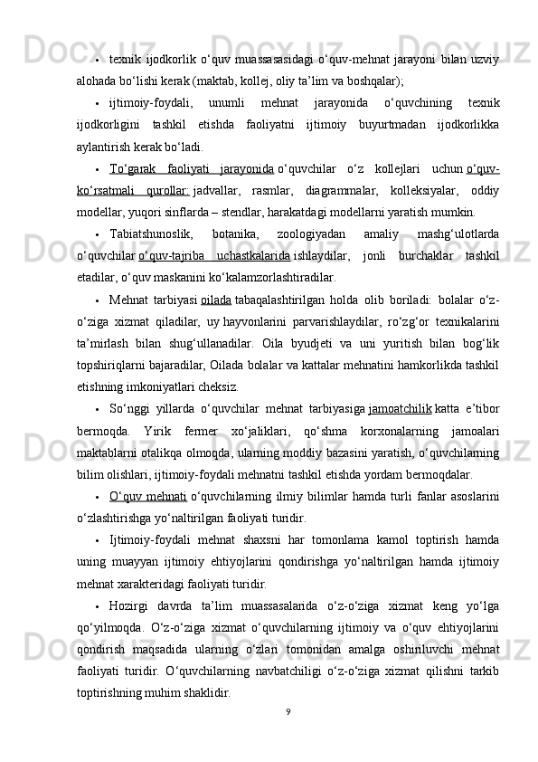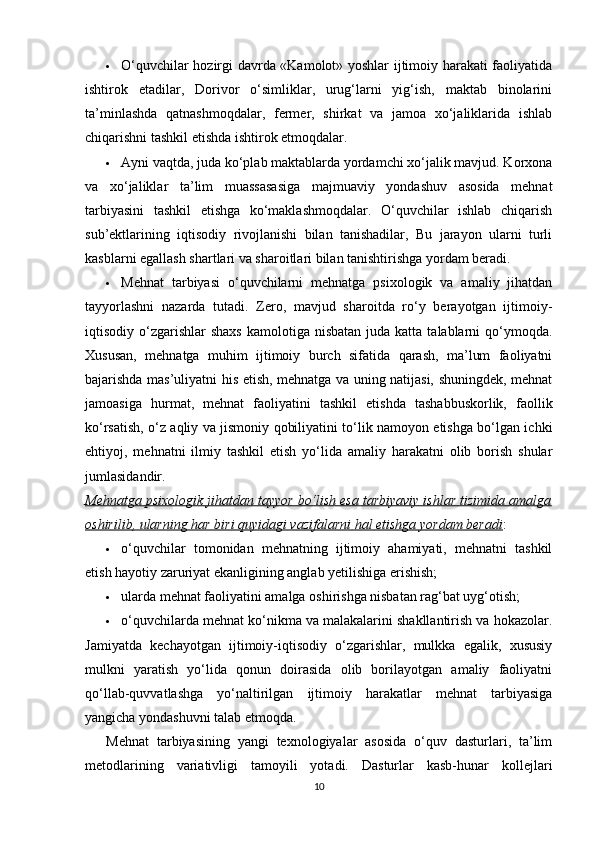 Mehnat tarbiyasi g`oyat keng falsafiy-pedagogik kategoriya bo`lib, «mehnat ta’limi», «kasbga yo`naltirish», «politexnik ta’lim», «kasb ta’limi» singari tu-shunchalarni o`z ichiga oladi. Mehnat tarbiyasi berish hamma zamonlarda ham jamiyat taraqqiyotining asosi, yoshlarni hayotga tayyorlashning eng muhim vositasi bo`lib kelgan. Shuning uchun ham barcha ilohiy kitoblar va hamma mutafakkirlar tomonidan yaratilgan bitiklarda Mehnat tarbiyasiga katta e’tibor berilgan. Lekin ularga materialist (moddiyunchi) lardan farqli tarzda Mehnat tarbiyasi deyilganda faqat jismoniy mehnatga doir ko`nikma va malakalarni shakllantirish ko`zda tutilmagan. Mehnat tarbiyasi, avvalo, oilada bola o`zini anglay boshlashi bilanoq amalga oshirila boradi. Jumladan, chaqaloklar go`daklik bosqichiga o`tishlari bilanoq, ularga dastlabki Mehnat tarbiyasi berila boshlanadi. Shunday qilinmasa, bola faqat iste’molchiga aylanib qoladi va natijada u noshud va yalqovgina emas, ma’naviyati kemtik shaxs ham bo`lib shakllanishi mumkin.Bolalarga Mehnat tarbiyasi berishda bog`cha, maktab singari ijtimoiy pedagogik muassasalar katta o`rin tutadi.